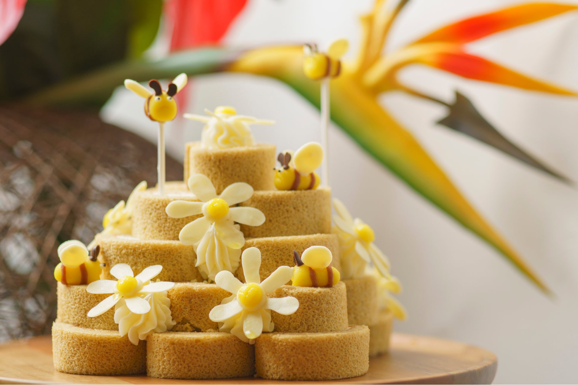 沖縄黒糖を使用したスポンジに、相性抜群の蜂蜜をスポンジとクリームに使用し香り豊かな黒糖ロールケーキ。手作りの蜂をトッピングし可愛らしい見た目が特徴です