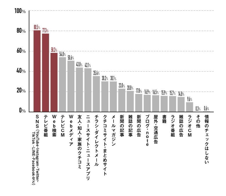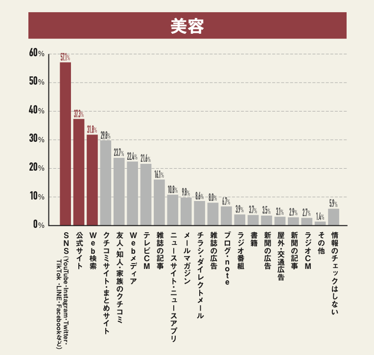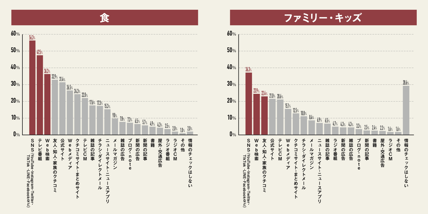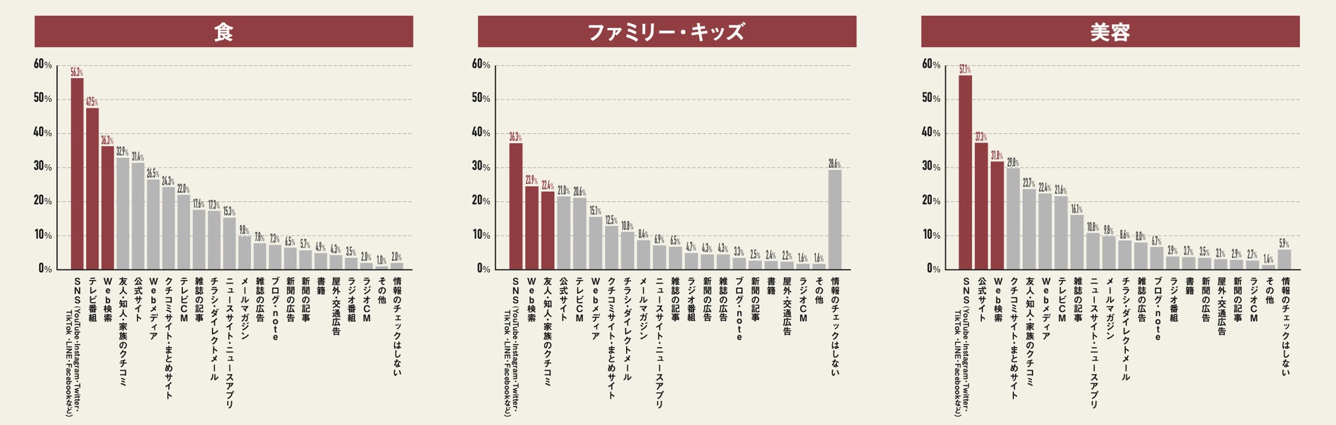 【ファミリー・キッズ】部門では2位「Web検索」23.9%、3位「友人・知人・家族のクチコミ」22.4%、4位「公式サイト」21.0 %となりました。家族や子どものものに関しては安全性などの懸念からか、身近な知人のクチコミも重視される傾向が見られます。ママ友同士のつながりにも注目すべきでしょう。【美容】部門では2位「公式サイト」37.3%、3位「Web検索」31.8%、4位「クチコミサイト・まとめサイト」29.8%となりました。ファッションや美容など、自分を磨く分野については、公式サイトのほか、クチコミサイトなどもチェックする傾向があります。