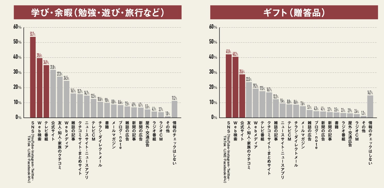【学び・余暇】は2位「Web検索」39.6%、3位「テレビ番組」34.9%、4位「公式サイト」31.8%となり、外出先や旅行先をWeb検索で調べたり、テレビ番組がきっかけとなり出かけることがあると推測されます。【ギフト】部門では2位「Web検索」40.2%、3位「公式サイト 」28.6%、4位「友人・知人・家族のクチコミ」23.5%と他者への贈り物ということもあり、公式サイトで「本物」を確認しながら情報収集する傾向があるものと思われます。