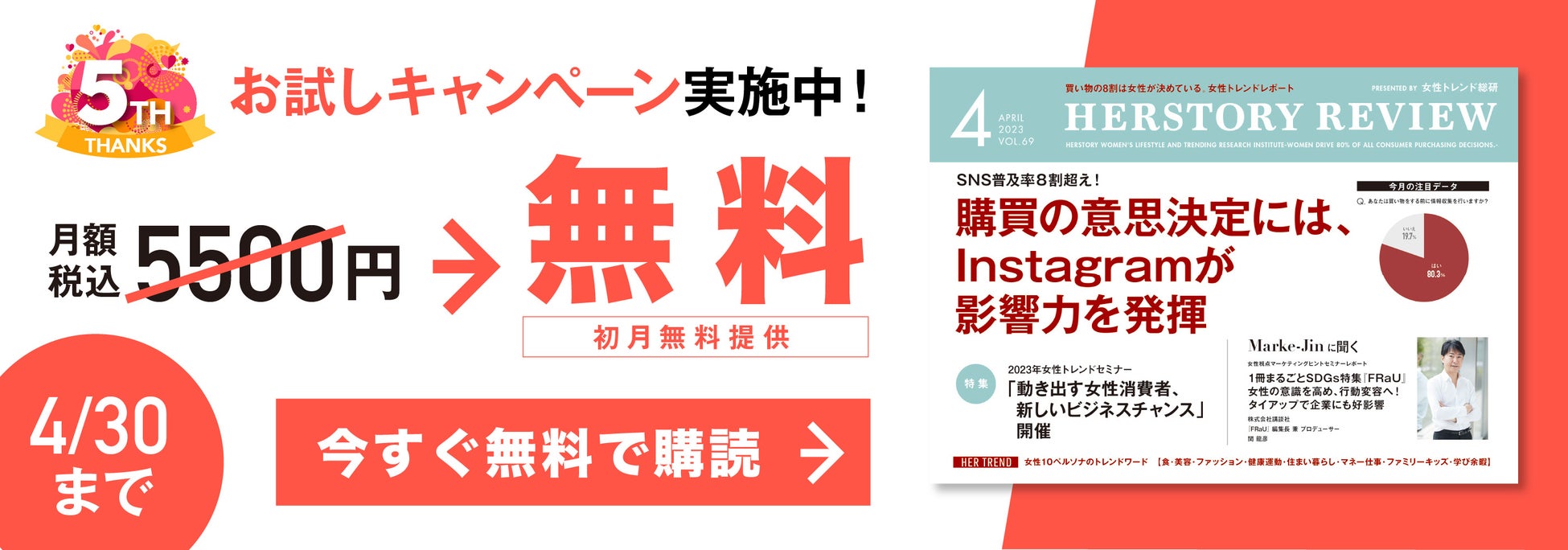 調査結果詳細を公開している女性トレンド月刊レポートHERSTORY REVIEWは1か月無料で購読できるキャンペーンを開催中(通常5,500円※月額/税込→無料)です。お得なこの機会にぜひ一度ご購読ください!