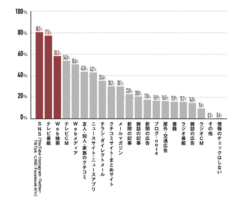上位3つは「SNS」80.5%、「テレビ番組」77.3%、「 Web検索」58.3%となりました。SNSの時代とも称される昨今において、SNSはエンターテイメントやコミュニケーションツールとしてでなく、日々の情報収集においても存在感を放っていることが分かります。マーケティングに際してもSNSの活用は必須であるといえるでしょう。とはいえ、テレビ番組も引き続き 情報収集のツールとしても大きな役割を果たしています。また情報源として、Web検索、テレビCM、Webメディアも半数以上います。年代別に見ると10〜40代はSNSが1位だが、50代以上はテレビ番組が逆転して1位となっています。ターゲットに合わせた発信媒体選びが重要といえるでしょう。