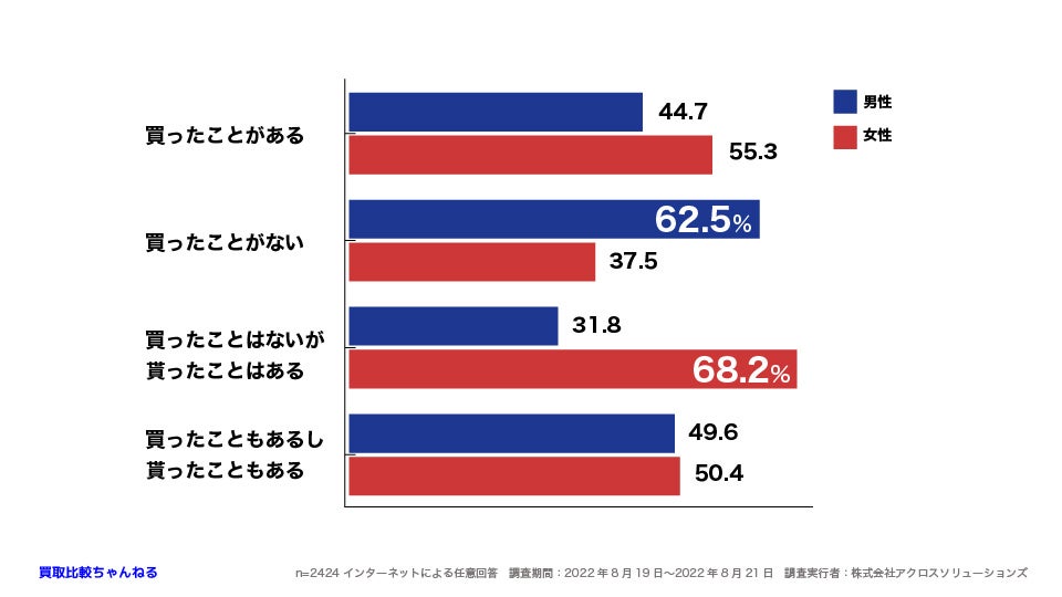 性別でみると、男性は「買ったことがない」と答えた人が多く、女性は「買ったことはないが貰ったことはある」という人が多くみられました。