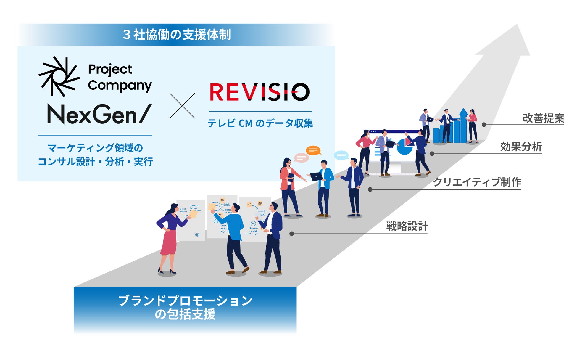 株式会社プロジェクトカンパニー(本社:東京都港区、代表取締役社長:土井 悠之介)、 REVISIO株式会社(本社:東京都千代田区、代表取締役社長:郡谷 康士)、株式会社NexGen(本社:東京都新宿区、CEO:金井 統)は、マーケティング支援の新たな取り組みとして、3社協働による「ブランドプロモーション支援」サービスの提供を開始いたします。