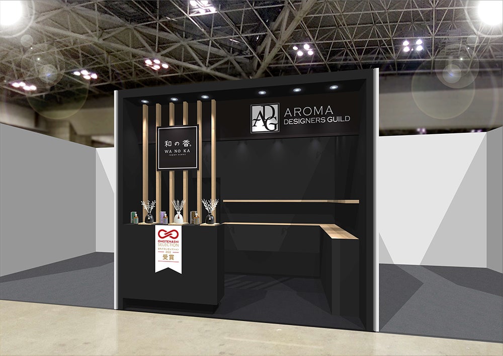 会場ブースは、ADGのイメージカラー黒を基調とし、木の温かさを取り入れたモダンなデザインとなっています。メインプロダクトには「OMOTENASHI Selection 2022(おもてなしセレクション)」金賞受賞で多くの外国人の皆様から多大な評価を得たリードディフューザー「和の香」を据え、日本のラグジュアリーを感じさせる香りのグッズを多数ご提案させて頂きます。また大手航空会社ラウンジやラグジュアリーホテルや高級レストランで採用されている業務用ディフューザーを使用した香り空間の演出も実際にご体験頂けます。