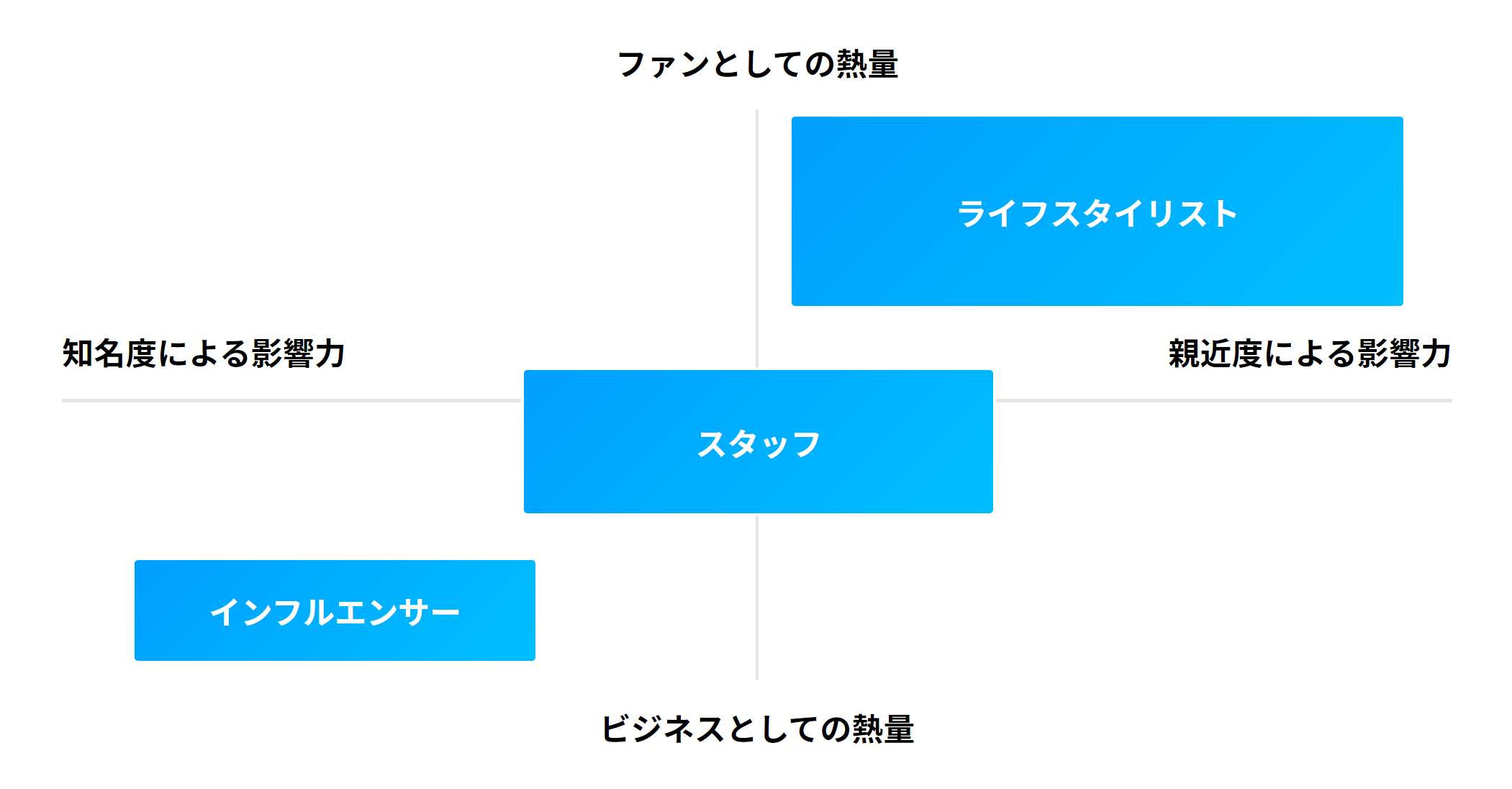 ライフスタイリストは、「好きを伝えたい!」というファンの熱量を持っており、周囲への親近度が高いことが特徴です。またインフルエンサーは市場に少数しかいませんが、生活者(ライフスタイリスト)は数が圧倒的に多く、応援活動が積み重なることでインフルエンサーよりも大きなインパクトを与えるポテンシャルを有しています。
