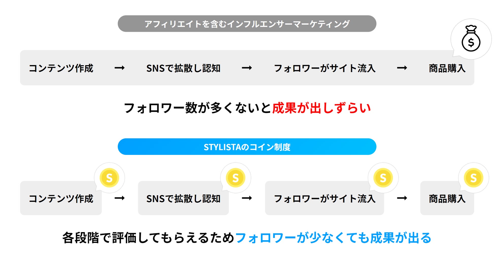 STYLISTAのコイン機能は、「相談に対する提案」や「まとめ」など好きなことでコンテンツを作成(以下、「応援活動」)するとコインが付与されます。アフィリエイトのように「商品購入」に至らずとも、「コンテンツを作成」など評価を段階的にすることで、生活者の参加しやすさを実現しています。また「コインを集める」というゲーム要素により継続性を生み出す仕組みになっています。