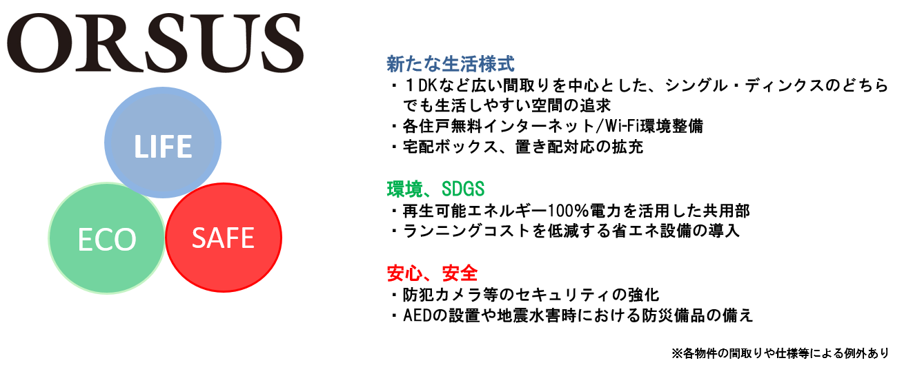 当社は、「中期経営計画Challenge & Progress」に掲げている、ビルディング事業における事業戦略である外部成長の推進の一環として賃貸レジデンスの開発・取得を推進しており、この度、多様化するライフスタイルや社会的ニーズに幅広く応えていくべく、新ブランド「ORSUS(オルサス)」として展開していくことといたしました。※2
