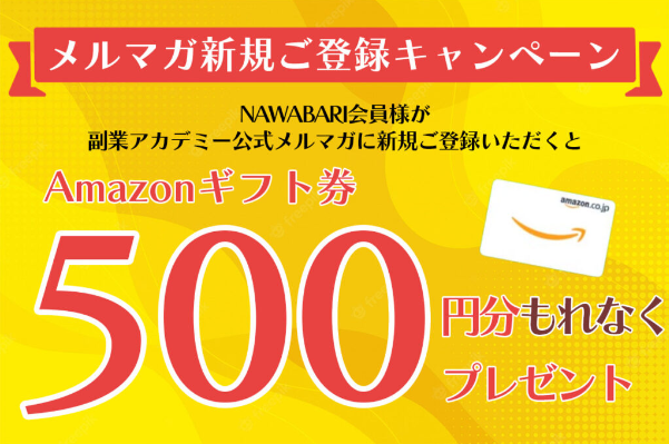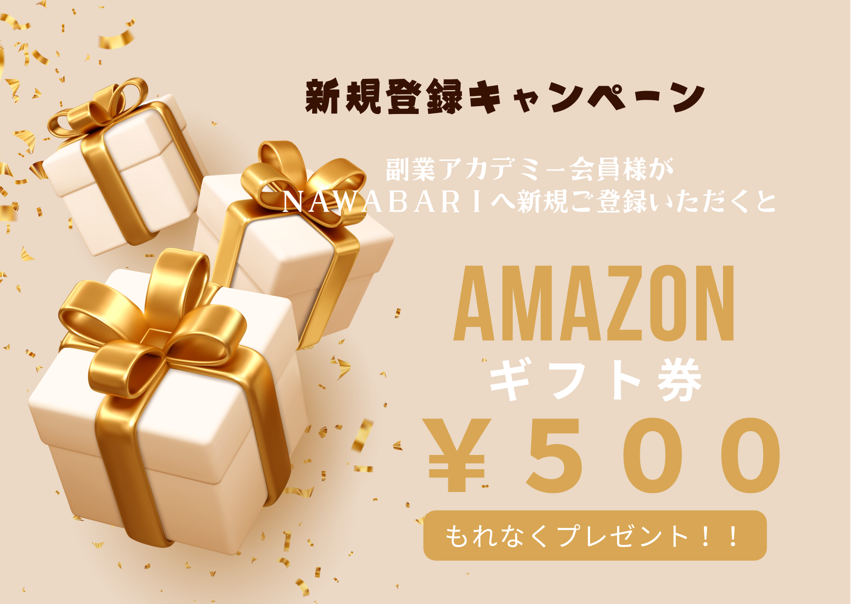 副業アカデミーのメールマガジン購読者でNAWABARIへ新規ご登録された方に、Amazonギフト券500円分をプレゼントいたします。
