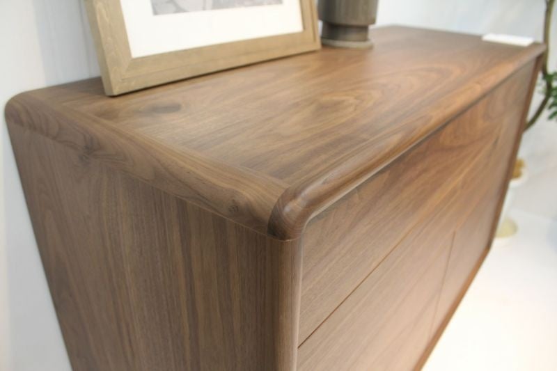 「ミュークチェスト」の前面は、取っ手を無くしたフラットなデザインを採用し、プッシュオープン機構を採用しています。このデザインにより、余計な凹凸がなく、木材の質感をそのまま楽しめます。高級感あふれるオーク材とウォールナット材の木目が美しく際立ち、どのようなインテリアにも馴染みやすい仕上がりです。