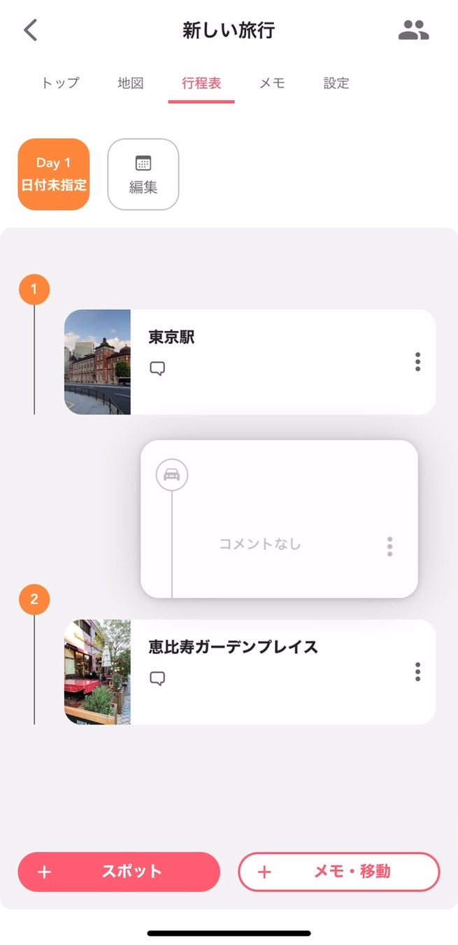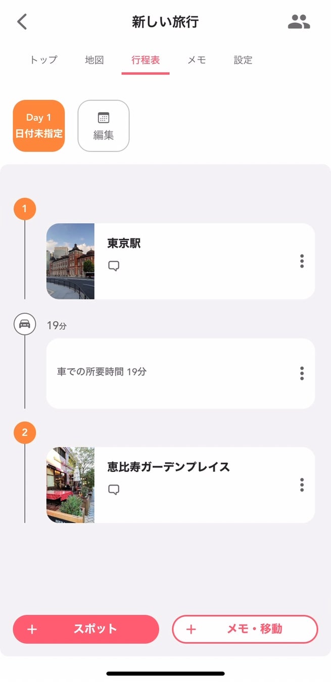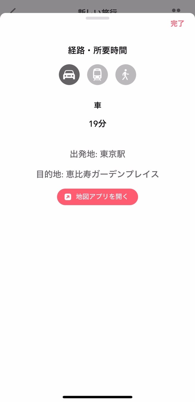 移動にかかる予想所要時間を自動的に計算してくれる機能です。行程表タブにてスポット間に「+メモ・移動」を追加いただき、アイコンを人・車・電車のいずれかに変更いただくことで、「徒歩」「車」「公共交通機関(電車,バス等)」の予想所要時間を表示します。
