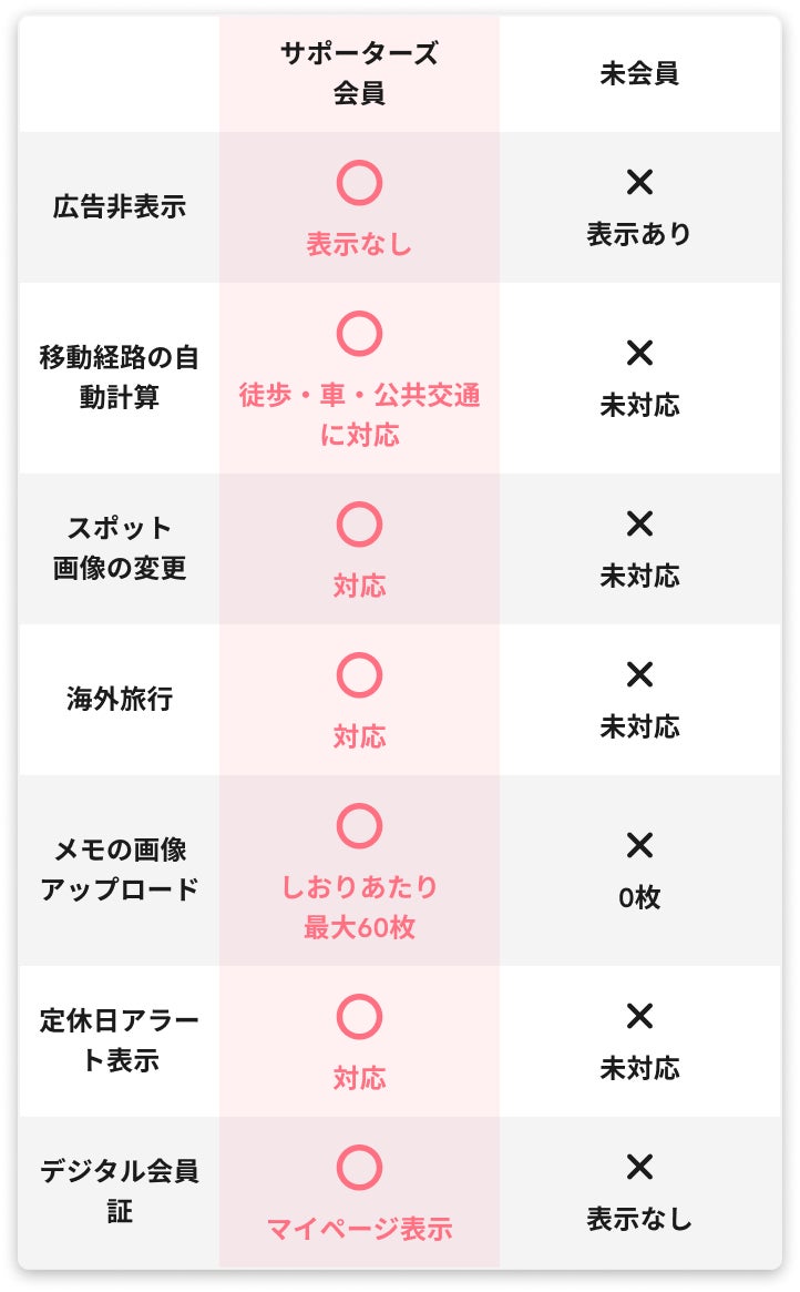 「ニコディ サポーターズ」は旅行計画アプリニコディが提供する有料会員機能です。海外旅行対応・画像アップロード・広告の非表示などプレミアム機能を提供しています。