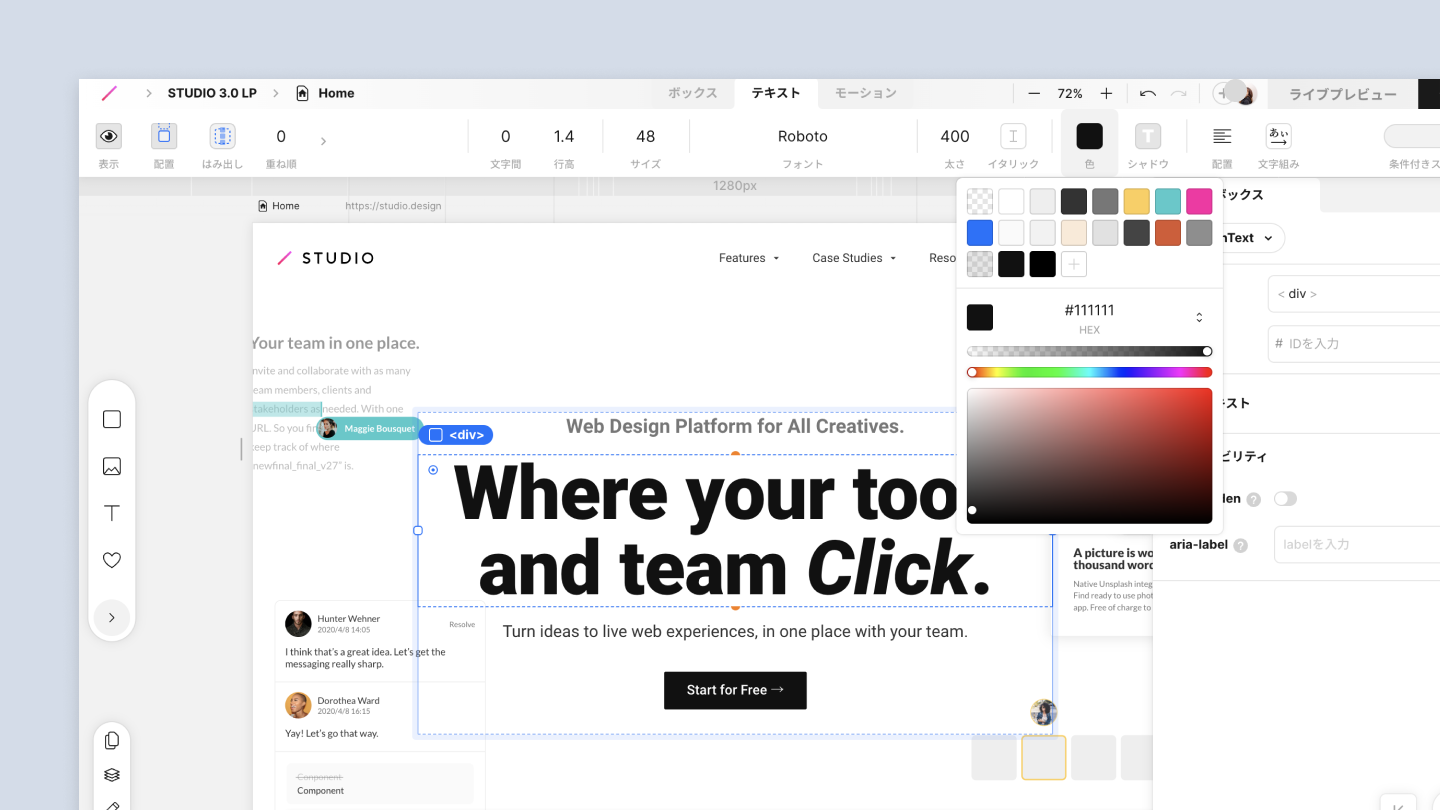 STUDIOはコーディングの学習不要で、わかりやすい直感的な操作でWebサイトを構築することができます。