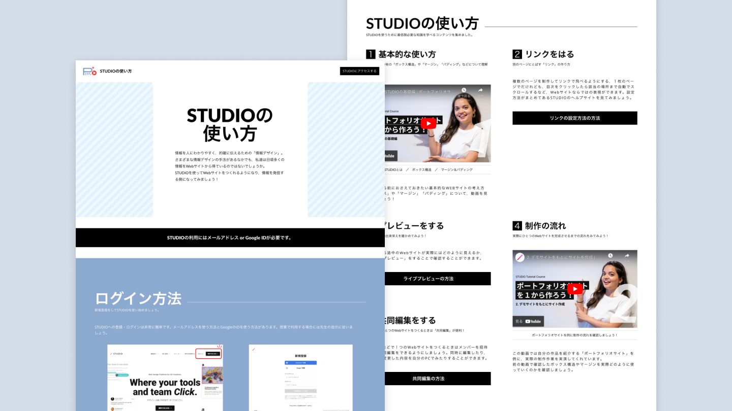 STUDIOを利用することで、HTMLやCSSの学習に費やしていた時間を情報デザインの本質となる課題の発見から評価・改善までの流れの理解や実践の学習に時間を費やすことができるようになります。