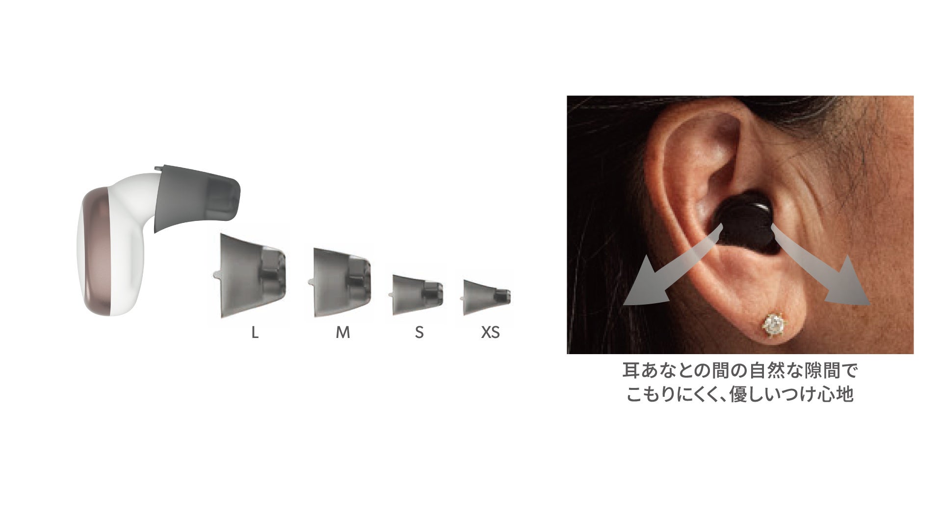 ●ワイヤレスイヤフォンのような、補聴器のイメージを覆す先進感のあるデザイン。