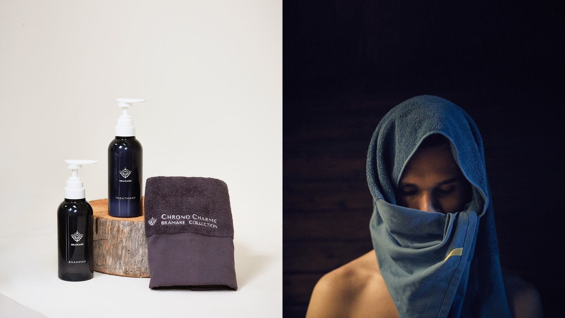 一枚で洗って、拭いて、巻くことができるオリジナルタオルは、オーガニックコットン純度99.99%を使用し、真ん中がタオル地に、端には丈夫な手ぬぐい生地を用いたハイブリット仕様。昨年発売した“ CHRONO CHARME BRAMARE COLLECTION (クロノシャルム ブラマーレコレクション)” *のイメージに合わせロゴ刺繍を施し、仕上げました。