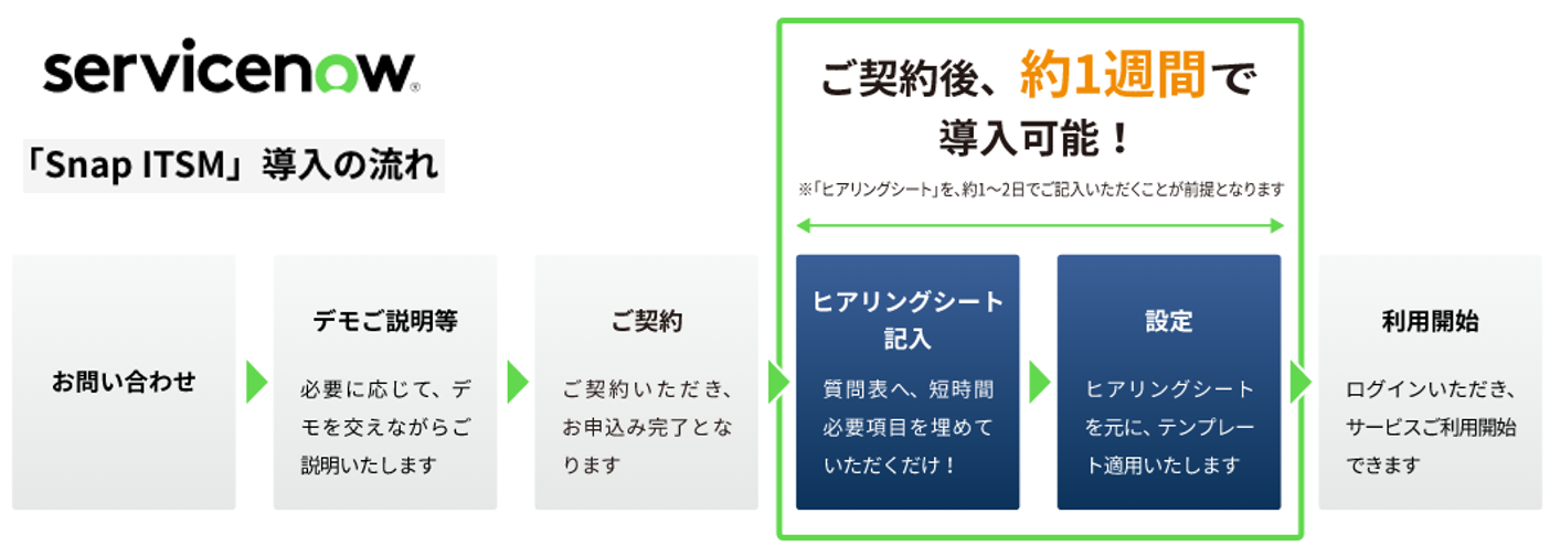 通常当社におけるServiceNow導入時には約3ヵ月要するところ、テンプレート化することで要件定義や開発の工程を削減しました。お申し込みから約1週間で利用開始を実現し、コストも大幅に削減することが可能となります。