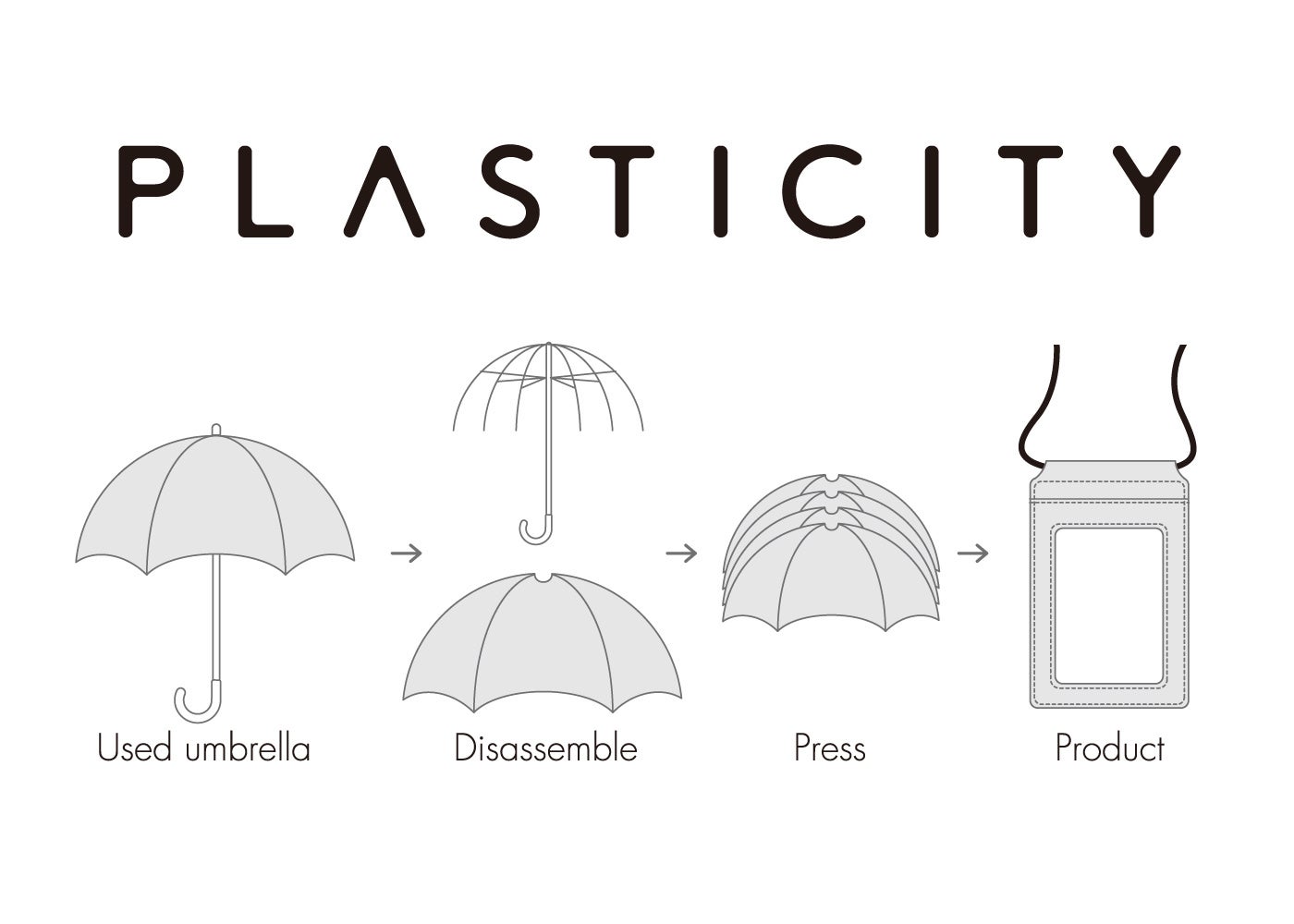 全ての製品には駅や商業施設等で忘れ物や置き忘れ等で最終的に廃棄されてしまうビニール傘を素材として全面にアップサイクルしています。防水性やメンテナンス性といった傘の持つ素材の特性を最大限活かすため、そのままの状態にて何層にも重ねてプレスをする独自の加工方法を開発。さらに、加工工程にて雨模様の表情を生み出す事により他の製品には無い独特な質感を持つ製品が完成しました。ビニール傘の回収から製品となる縫製まですべて人の手により一つ一つ細やかな作業が行われており、人間の感覚、職人の熟練した技術、素材を大切にする想いによりPLASTICITYの製品が生み出されていきます。