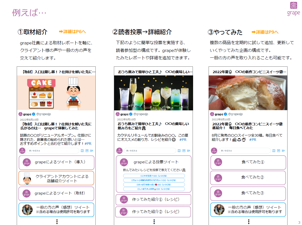 企業の訴求トピックについて、ウェブメディア『grape』がTwitter上の情報を一つにまとめ、発信・拡散まで一貫して行います。