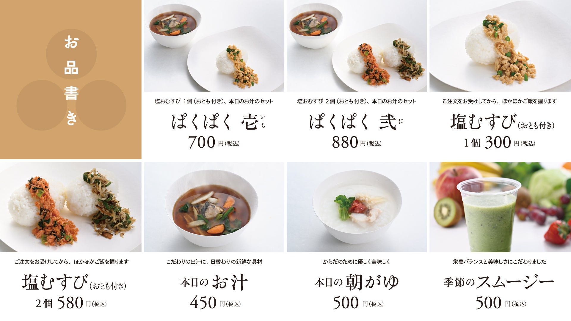 塩おむすび一つにつき、お好きなオリジナルのおともを添えてご提供いたしております。