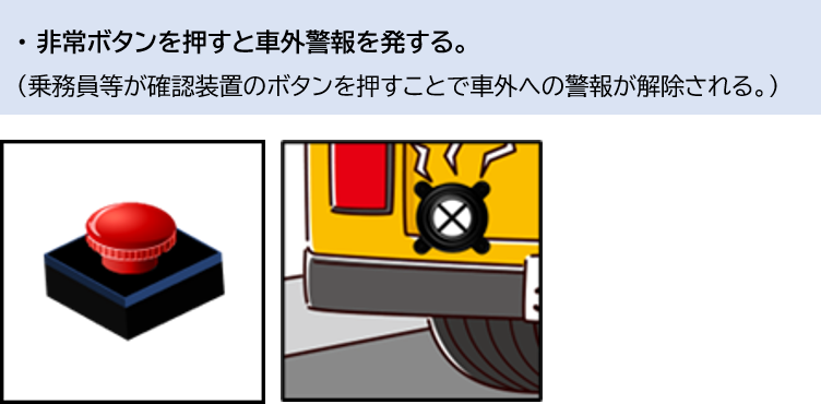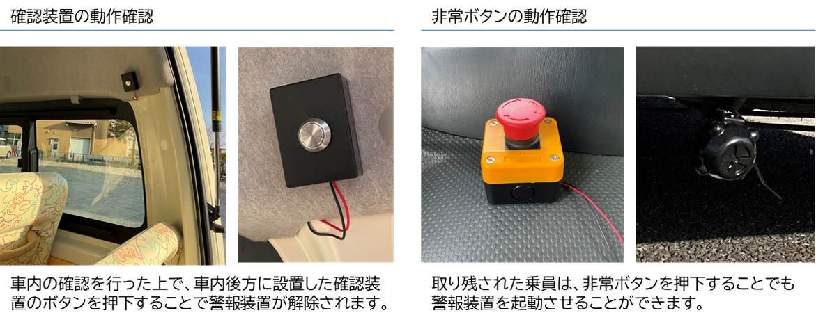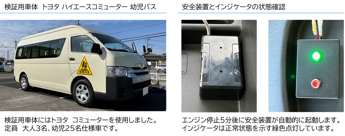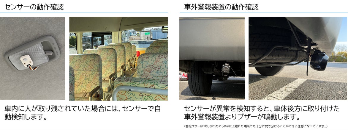 *1 「送迎用バスの置き去り防止を支援する安全装置のガイドライン 令和4年12月20日 送迎用バスの置き去り防止を支援する安全装置の仕様に関するガイドラインを検討するワーキンググループ」(以下、国土交通省ガイドライン)に準じた仕様ならびに検証を行ったものであり、公益財団法人日本自動車輸送技術協会「送迎用バスでの乗員置き去りの防止を支援する安全装置の性能認定」を申請中です。