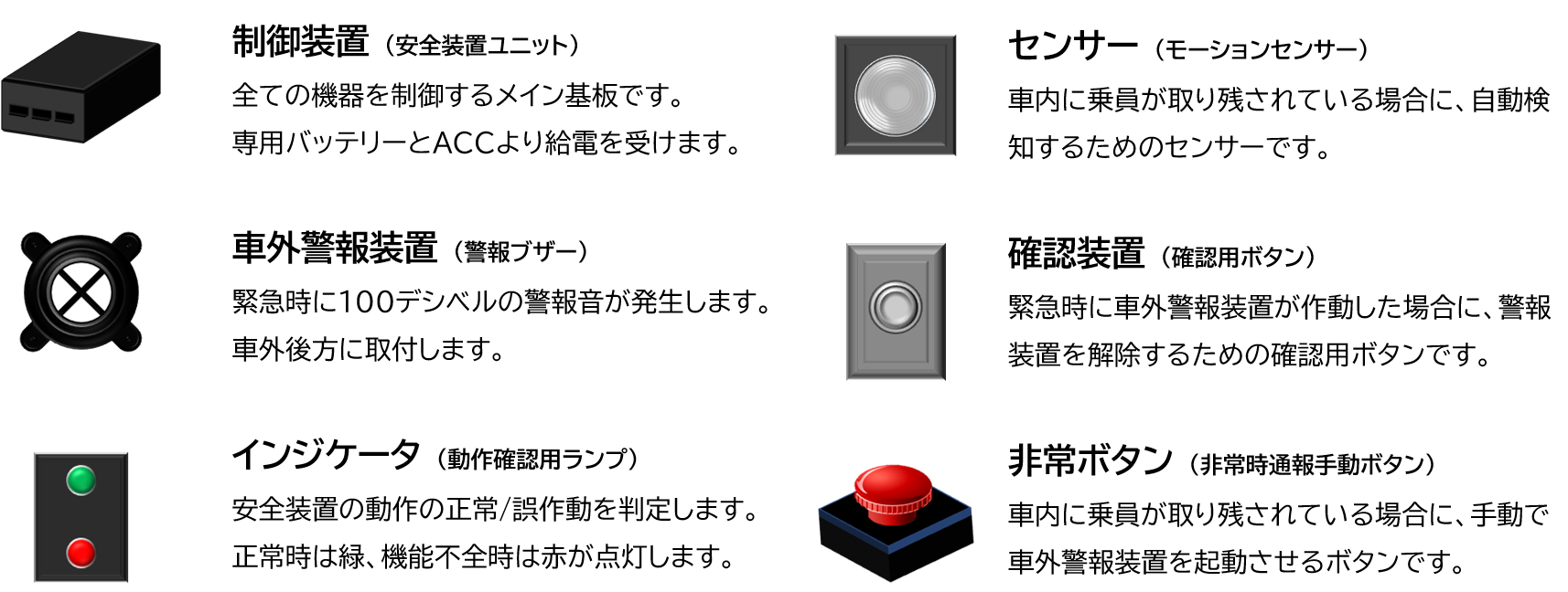 国土交通省が策定した送迎バスの置き去り防止を支援する安全装置のガイドラインに沿って、当社では独自のシステム開発技術と車載機器ベンダーのハードを組み合わせることで安全装置を開発しました。