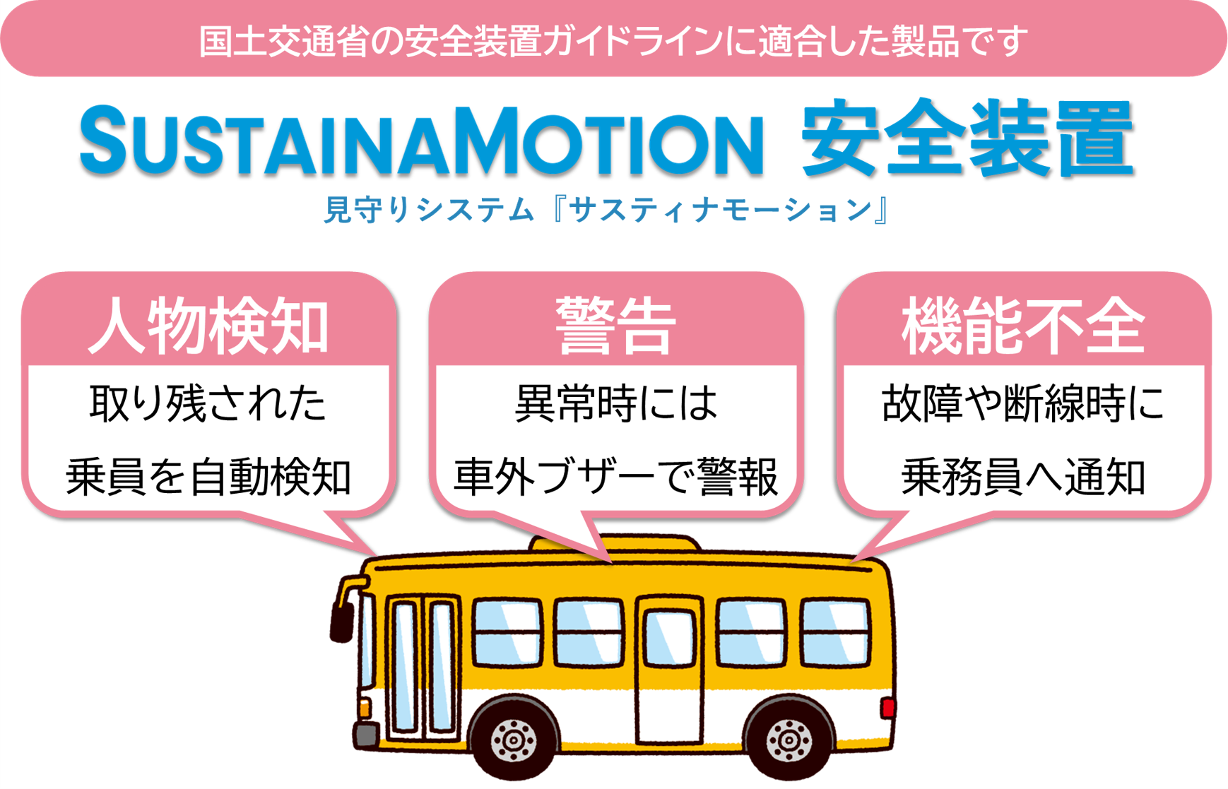 【送迎バス安全装置】見守りシステム「サスティナモーション」から、国土交通省ガイドラインに適合した送迎バス安全装置の事前申込を開始。