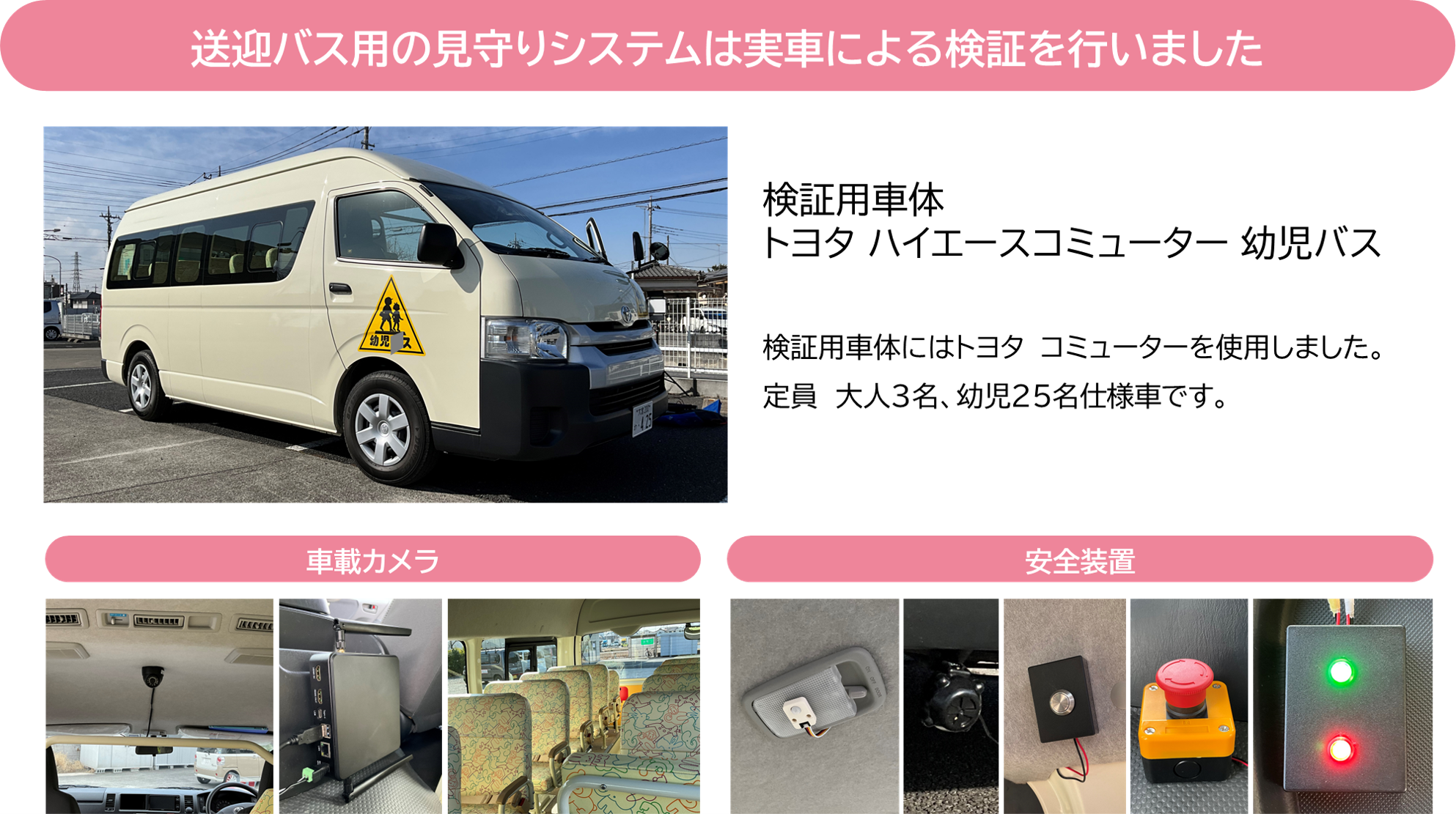 使用場所:幼稚園・保育園の送迎・通園バスなどあらゆるスクールバスと送迎車両に対応