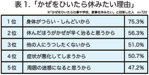 今回の調査結果では、「かぜをひいたら自分のためにも、周囲のためにも休みたい」という気持ちと「休みたいのに休めない」環境のギャップが明らかになりました。