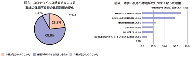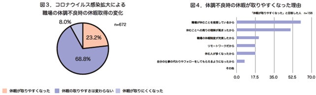 昨今のコロナウイルス感染拡大などの社会環境変化により、かぜ等の体調不良時には、約2割の人が「休暇が取りやすくなった」と回答しています。