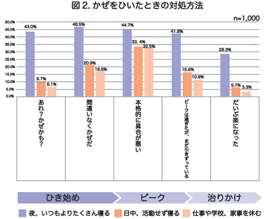 2.かぜをひいたときは、約半数が「夜にいつもよりたくさん寝て対処」
