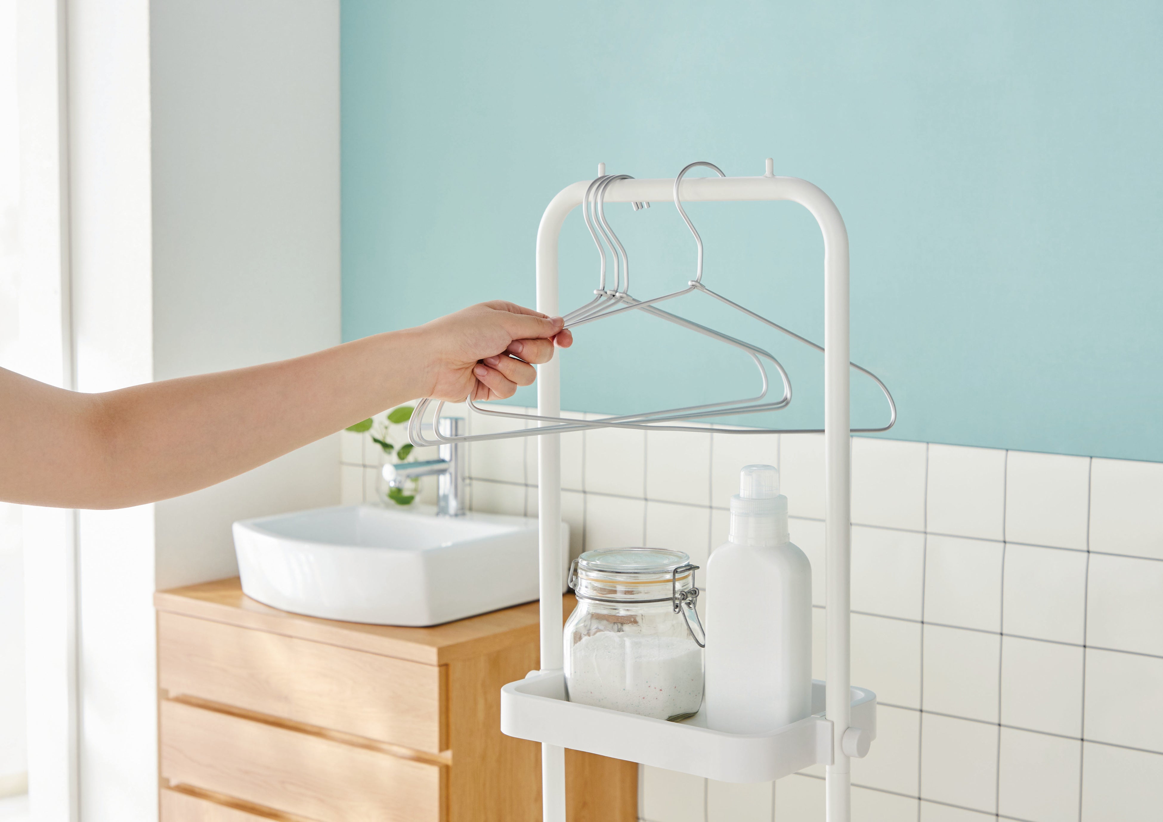 ハンガーバーが付属しているので、使い終わったハンガーを収納できます。上段トレーには洗剤類、下段トレーにはハーフサイズのバスタオルやフェイスタオルの収納に便利です。