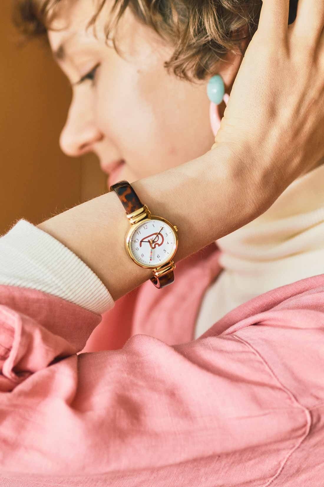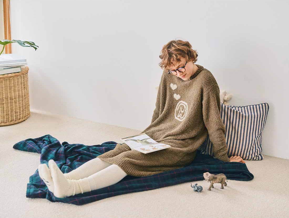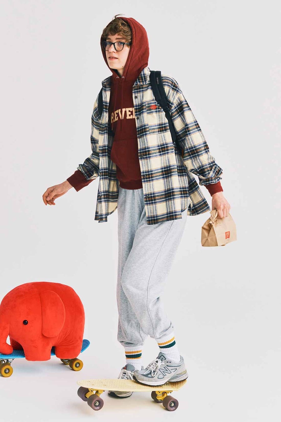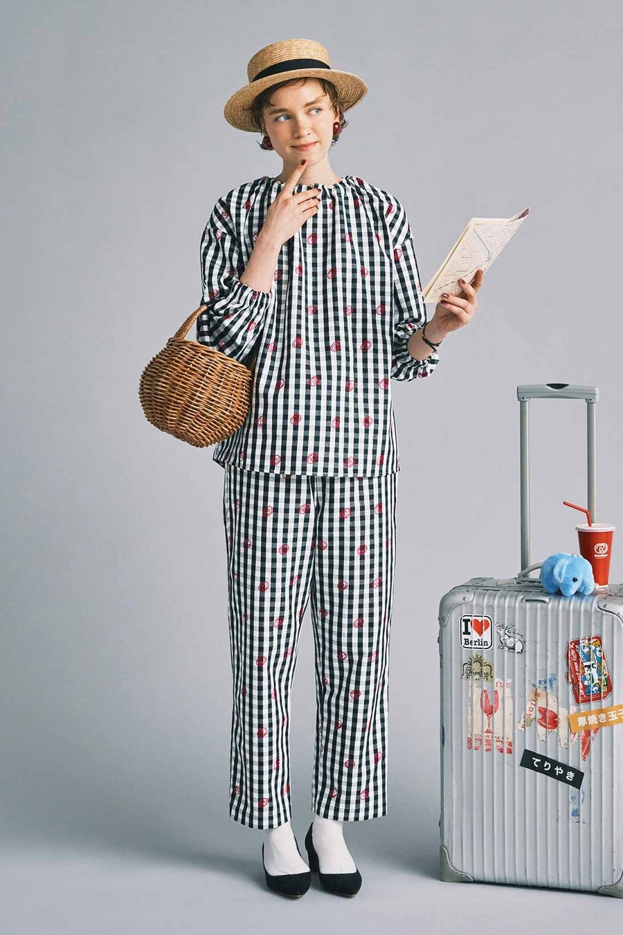 夏から秋にかけて着まわせるチェックシャツは、胸ポケットにどむぞうくんを刺しゅう。