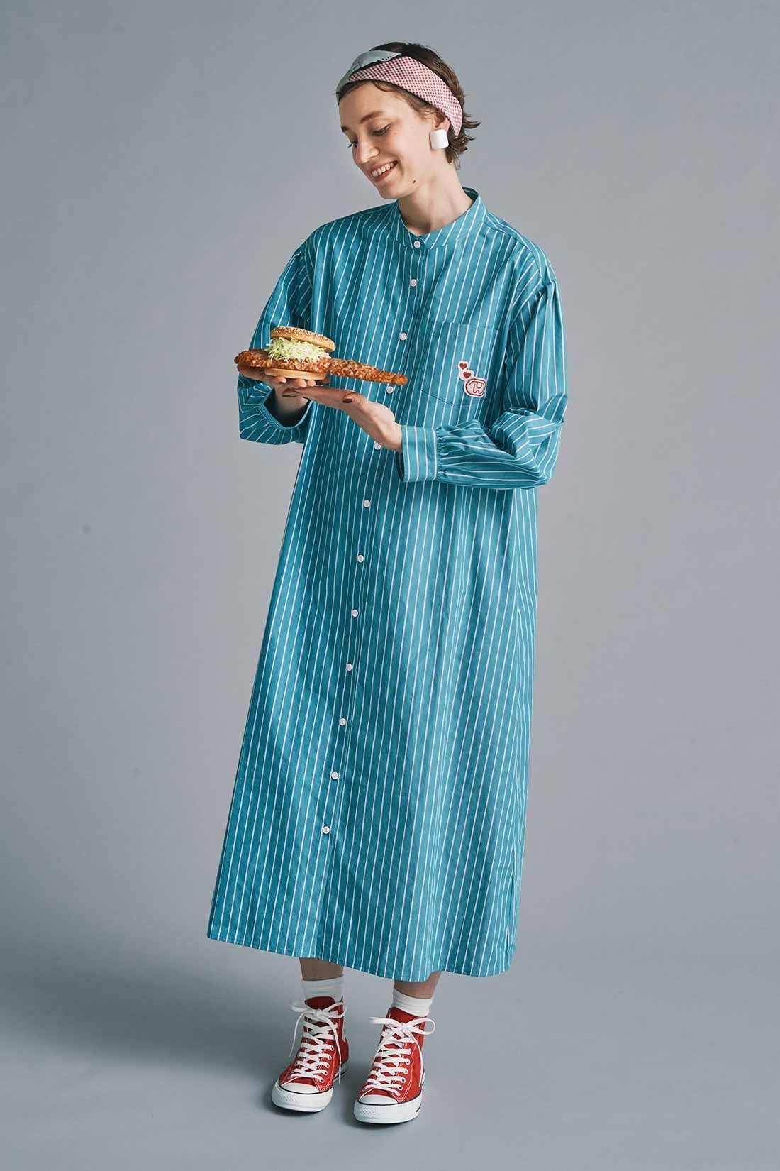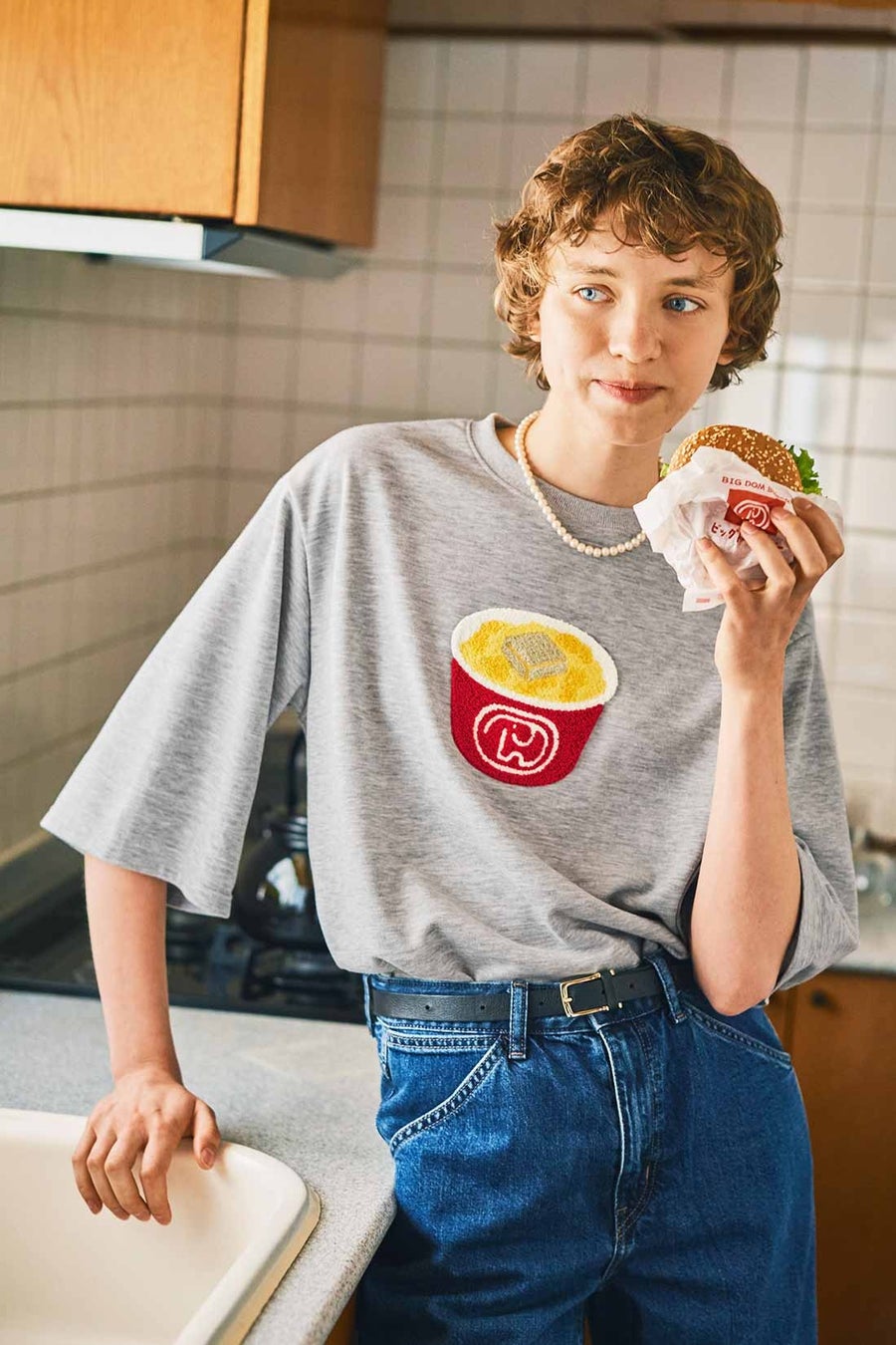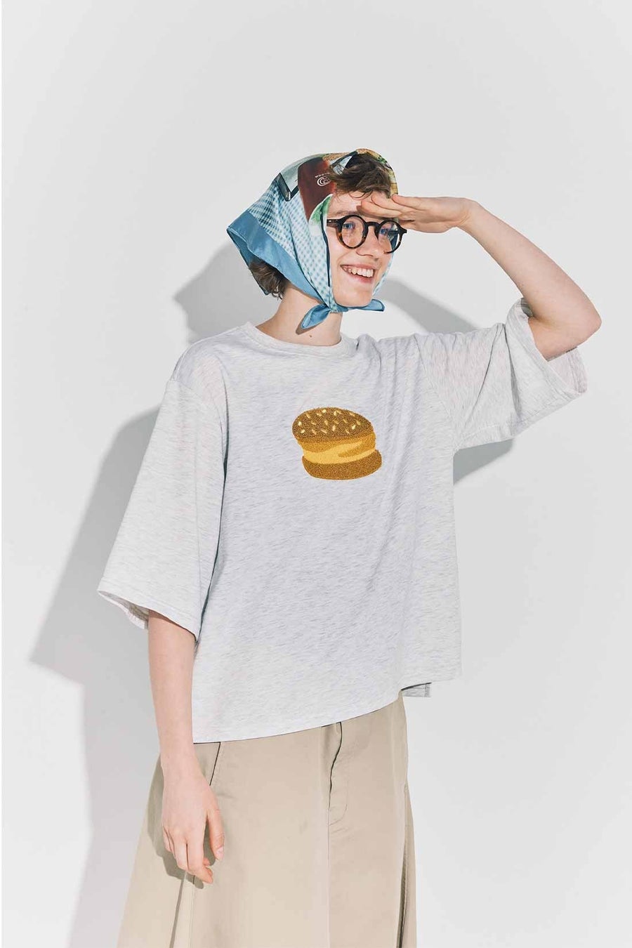 ふかふかのさがら刺しゅうで「ドムドムハンバーガー」人気のメニュー〈バターコーン〉〈手作り厚焼きたまごサンド〉を薄手のミニ裏毛素材でつくった七分袖のトップスにどどーんと刺しゅうで表現。まだ暑さの残る初秋から着られるアイテムです。