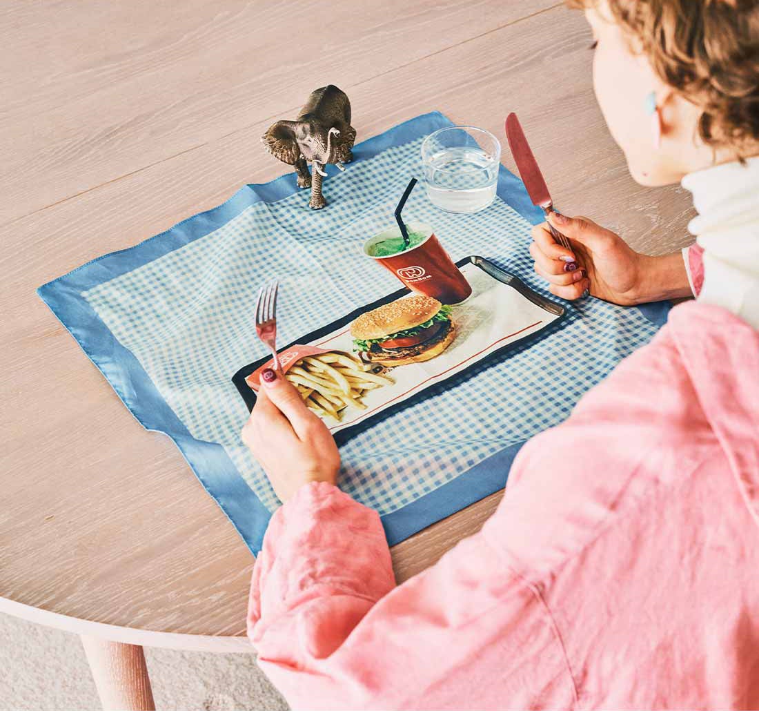 ランチタイムはイートイン希望。でもかなわないそんな悲しい日は3種類の人気のメニューがプリントされたスカーフにも使えるハンカチを広げて、お店気分を満喫できます。こちらも大好きなメニュー3種類をギンガムチェックに並べてそれぞれコラボレーションのために撮りおろしてプリントしています。