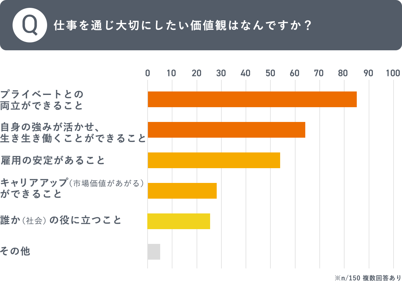 仕事を通じ大切にしたい価値観のアンケートにおいては、「プライベートと仕事の両立」を望む声が多い中、次いで「自身の強みが発揮でき生き生きと働くことができること」を望む声が多く見られました。