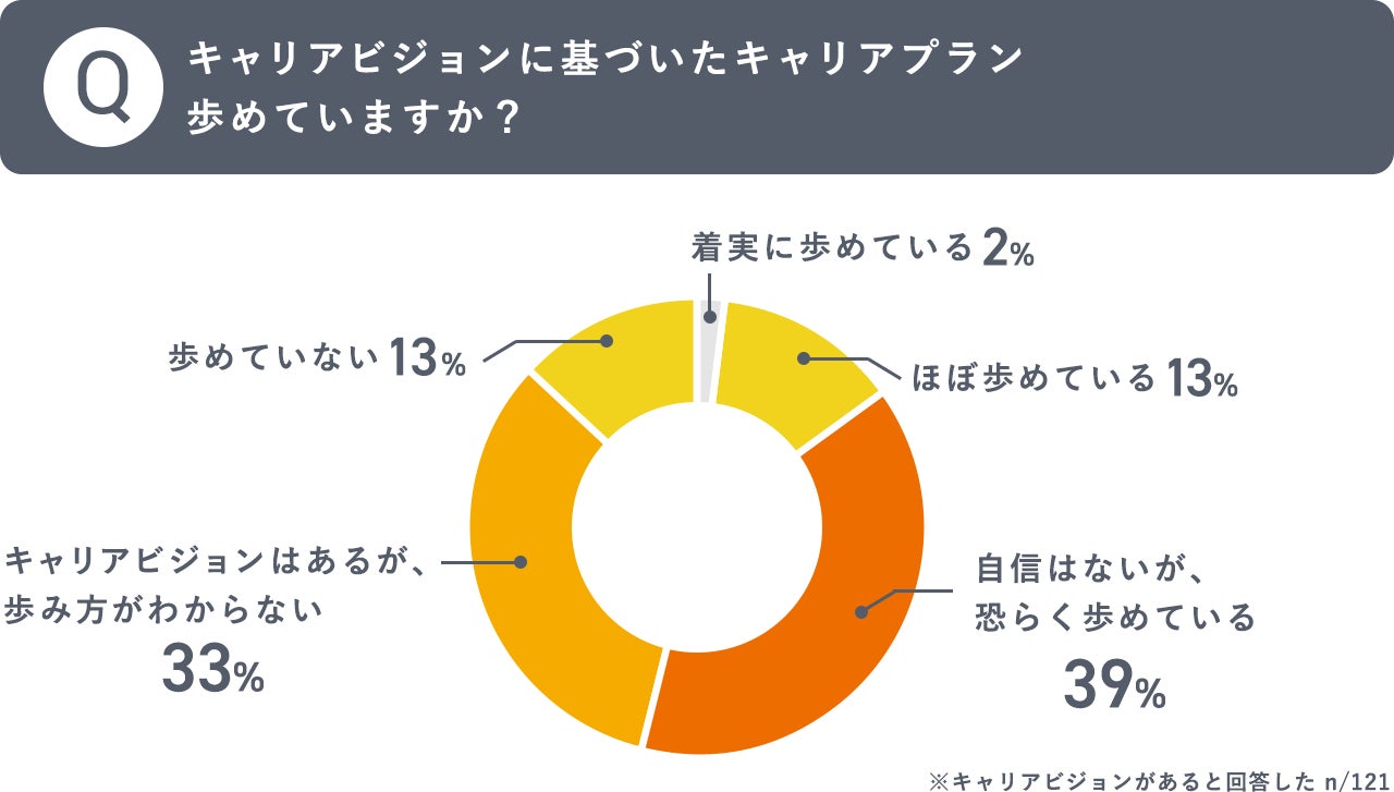 またキャリアビジョンに沿ったキャリアプランを歩めているとの回答は15%程度で、85%はキャリアビジョンは持っているものの、自身で納得したキャリアを歩めている状況ではないことが分かっています。