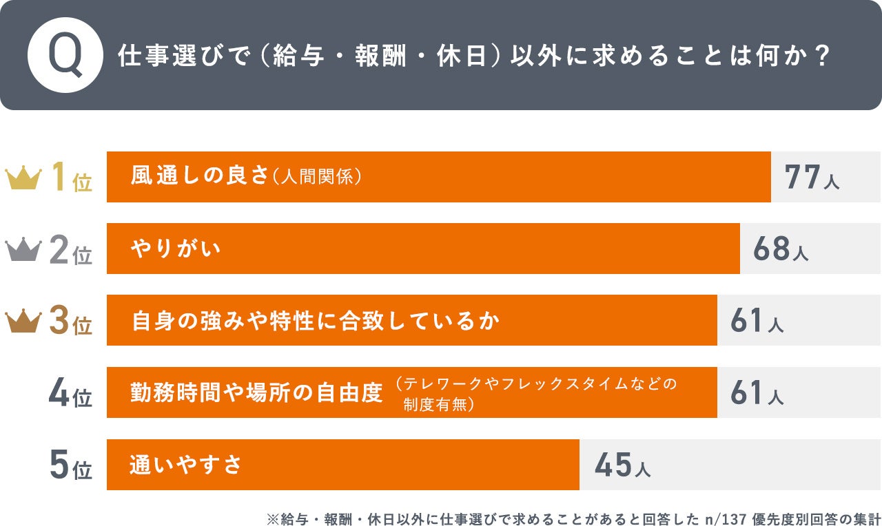 仕事選びにおける価値観の調査では、職場における人間関係の良さに加え、仕事にやりがいを求めたり、自身の強みや特性に合致しているかどうかを重視し、企業やキャリアを選ぶ人が増えていることがわかりました。