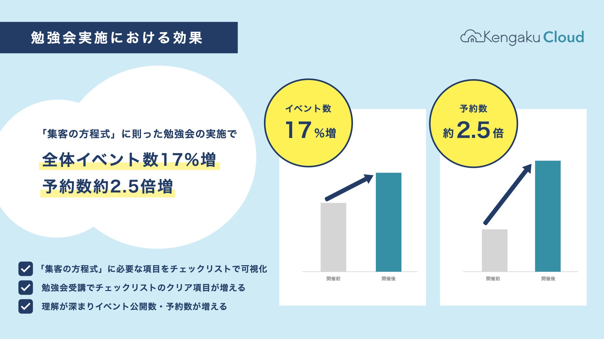 アイフルホームではシステム導入後、FC加盟店に馴染ませることが重要だと考え、ビス・クリエイション考案の「集客の方程式」に則った勉強会を複数回開催しました。勉強会の実施でFC加盟店のシステムに対する理解が深まり、使いこなせるFC加盟店も増えたことで、しっかりと予約が取れる事例も出てきています。実際に勉強会実施前後で全体のイベント数は17%増、イベントの質まで担保できたFC加盟店では予約数が2.5倍増となっています。