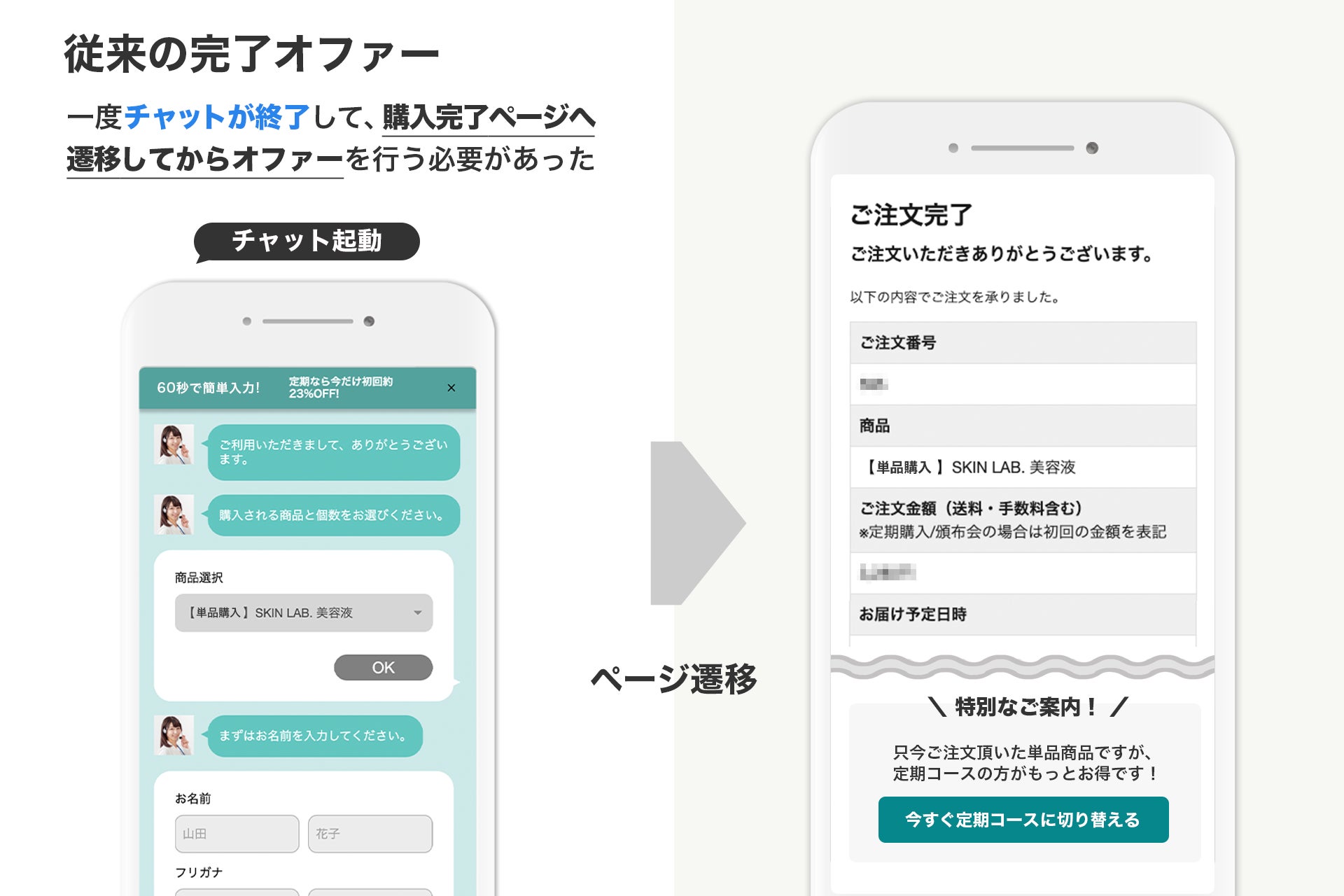 通常は購入完了時に購入完了ページに遷移しますが、『シームレス完了オファー機能』を使用すれば、購入完了時にチャット内でアップセルのご案内が可能となり、ユーザーにとって心地よい購買体験の提供ができます。