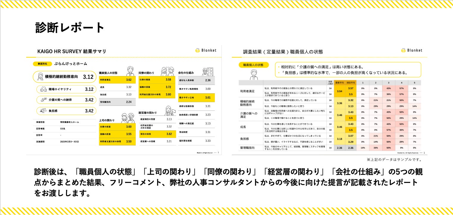 本サーベイは、約130社の介護・福祉事業所の採用・育成支援に携わってきたBlanketの知見を活かし介護福祉事業者に特化して設計されています。