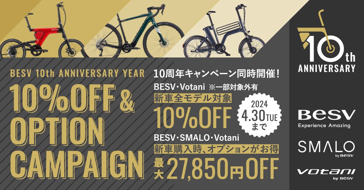株式会社BESV JAPANは、2024年度をBESV 10th Anniversary Yearとして、1月以降、当社製品のご利用ユーザー様や新規のユーザー様に向けて、様々なキャンペーンをご提供しております。現在、実施中の新車10%OFFキャンペーンもご好評を抱いている中、さらに、3月16日(土)から4月30日(火)の間、新車購入時に限り、お得にオプションセットが同時購入できるキャンペーンとして「春のオプションキャンペーン」を追加&同時開催いたします。これによって、新車もオプションセットもますますお得にお買い上げいただけるキャンペーン期間となります。