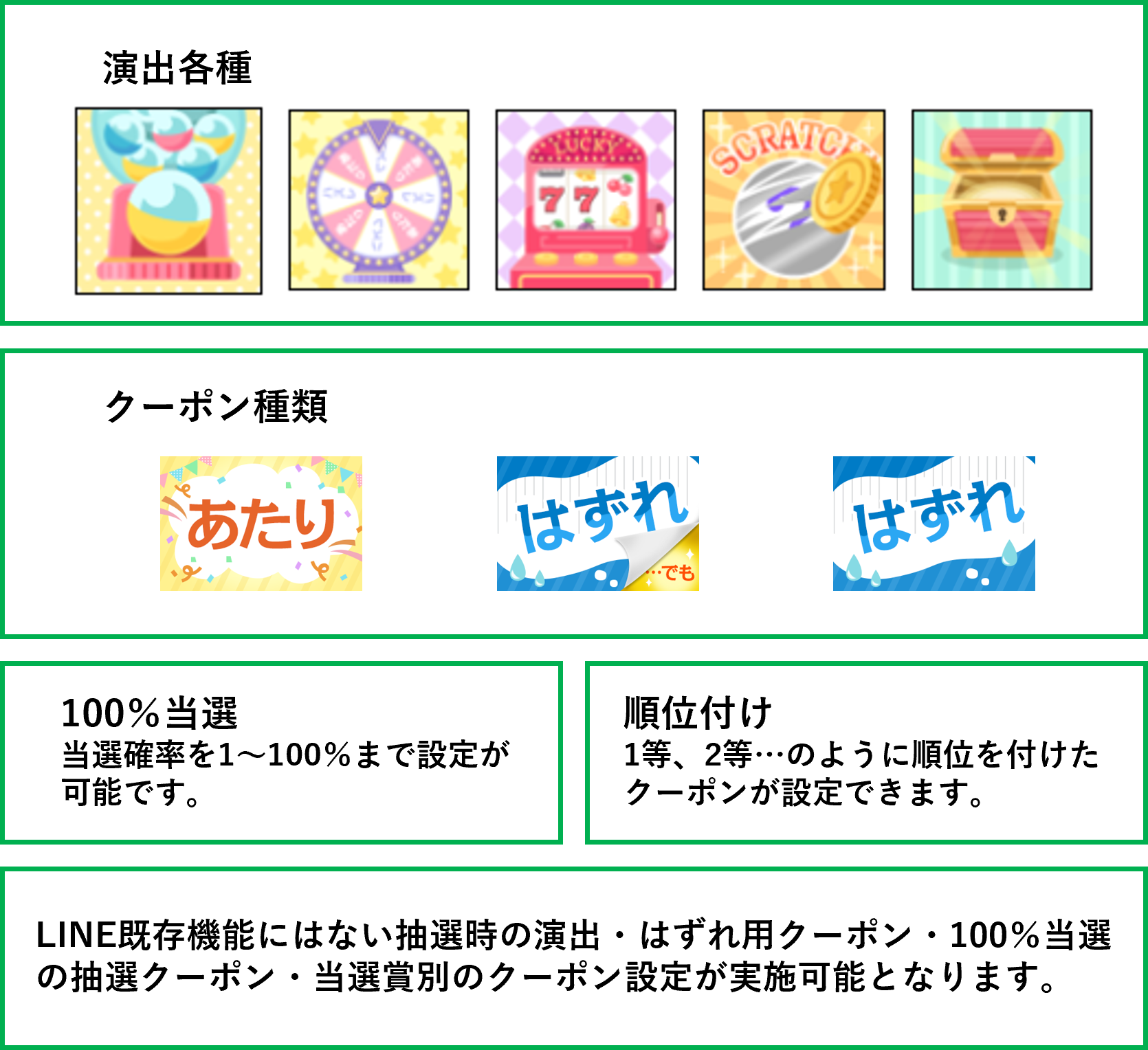 LINE公式アカウントの既存機能では使用用途が絞られてしまうため、クーポンに楽しさと幅広い活用方法を可能にするための機能となります。既存のクーポン機能ではできない設定が複数あり、全アカウント一括設定が可能となります。