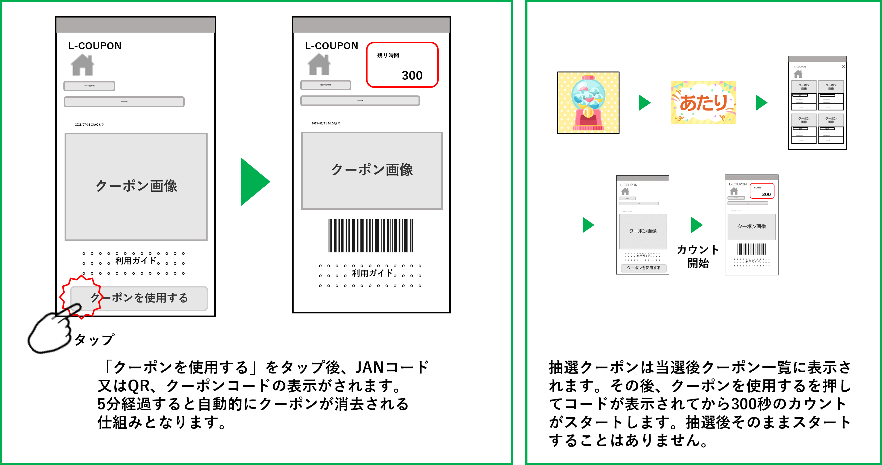無人レジなどの導入によりクーポンが使用できなくなることや消込忘れなどの事象を防ぐため、使用後自動的に使用済みになる時限式クーポンとなっております。