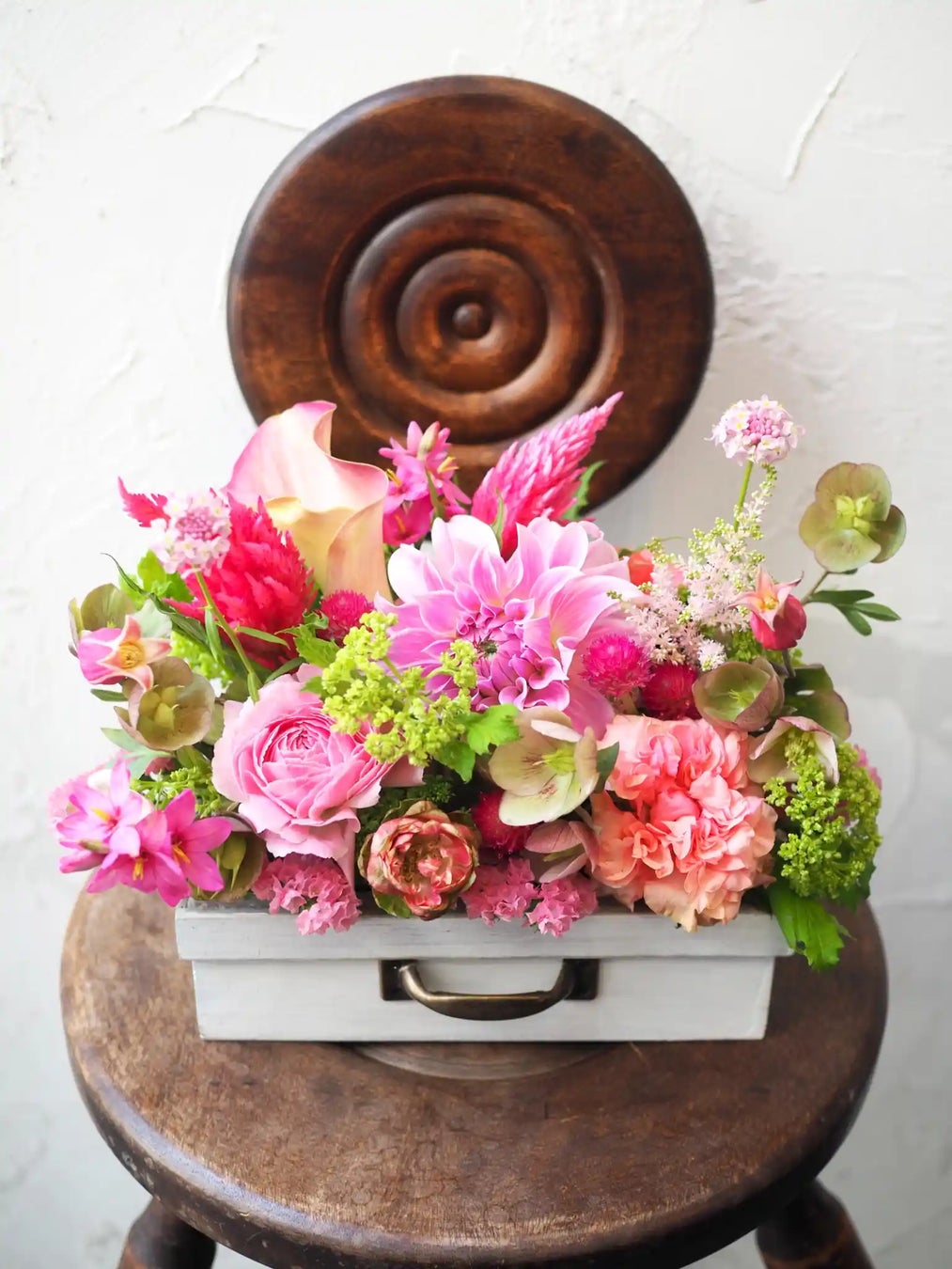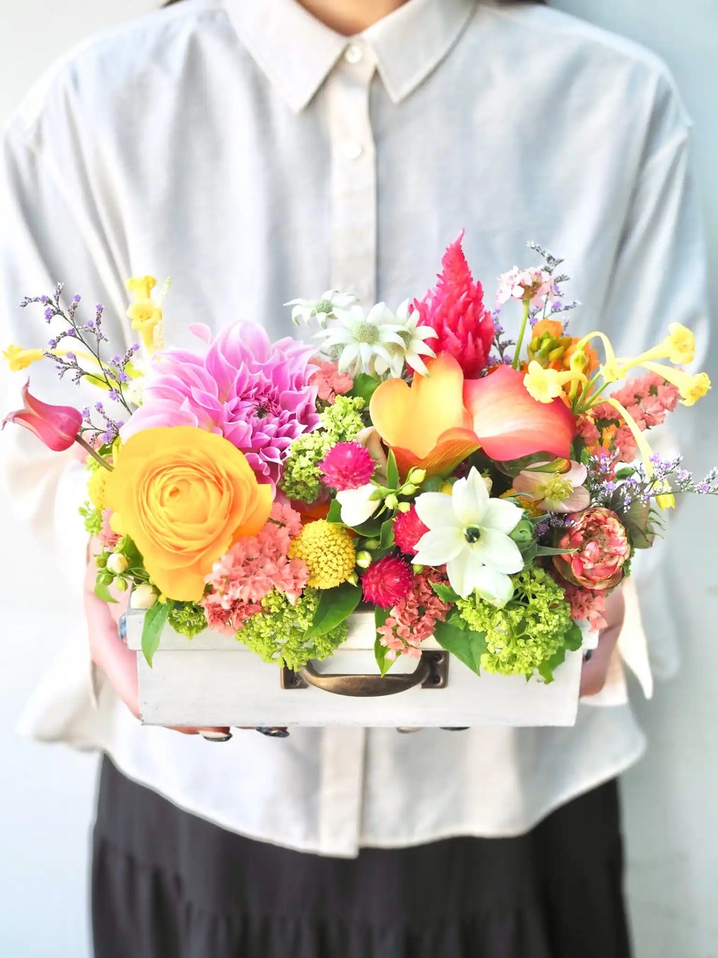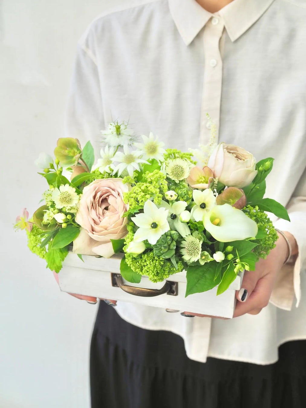 こちらは季節ごとの新鮮なお花をぎゅっと詰め込んで、ウッドトランクの中にナチュラルであたたかみのあるデザインで仕上げます。ちょっとした贈り物やご自宅用にもぴったり。温もりある木箱が、お花の魅力をいっそう引き立ててくれます。