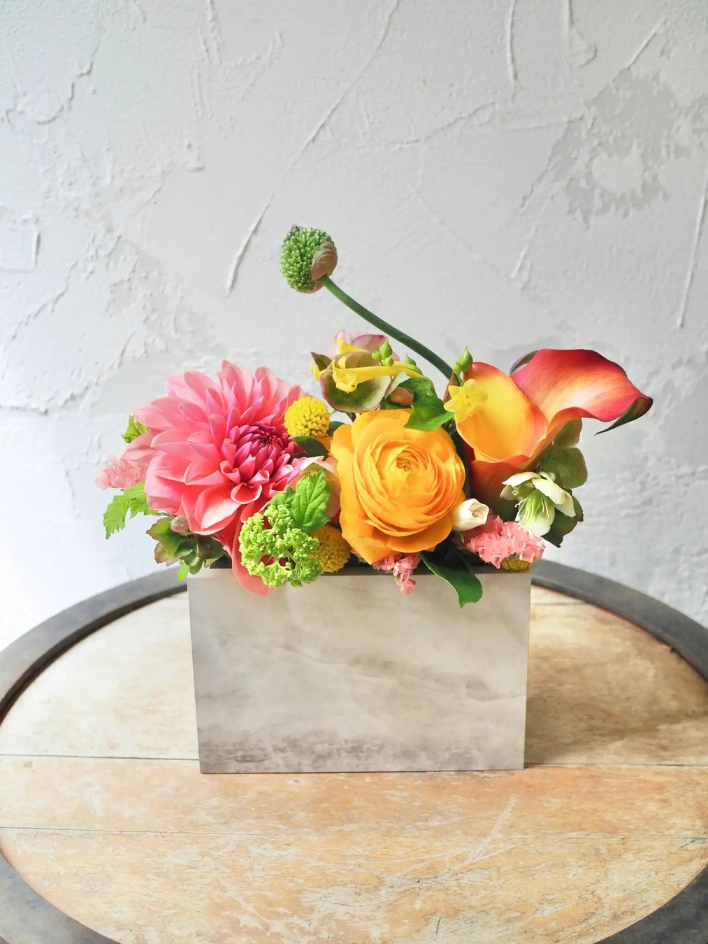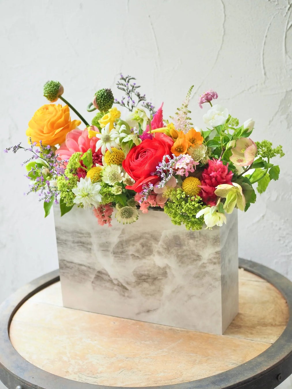 大理石風ベースとウッドトランクの鮮やかなおまかせフラワーアレンジが新登場。
