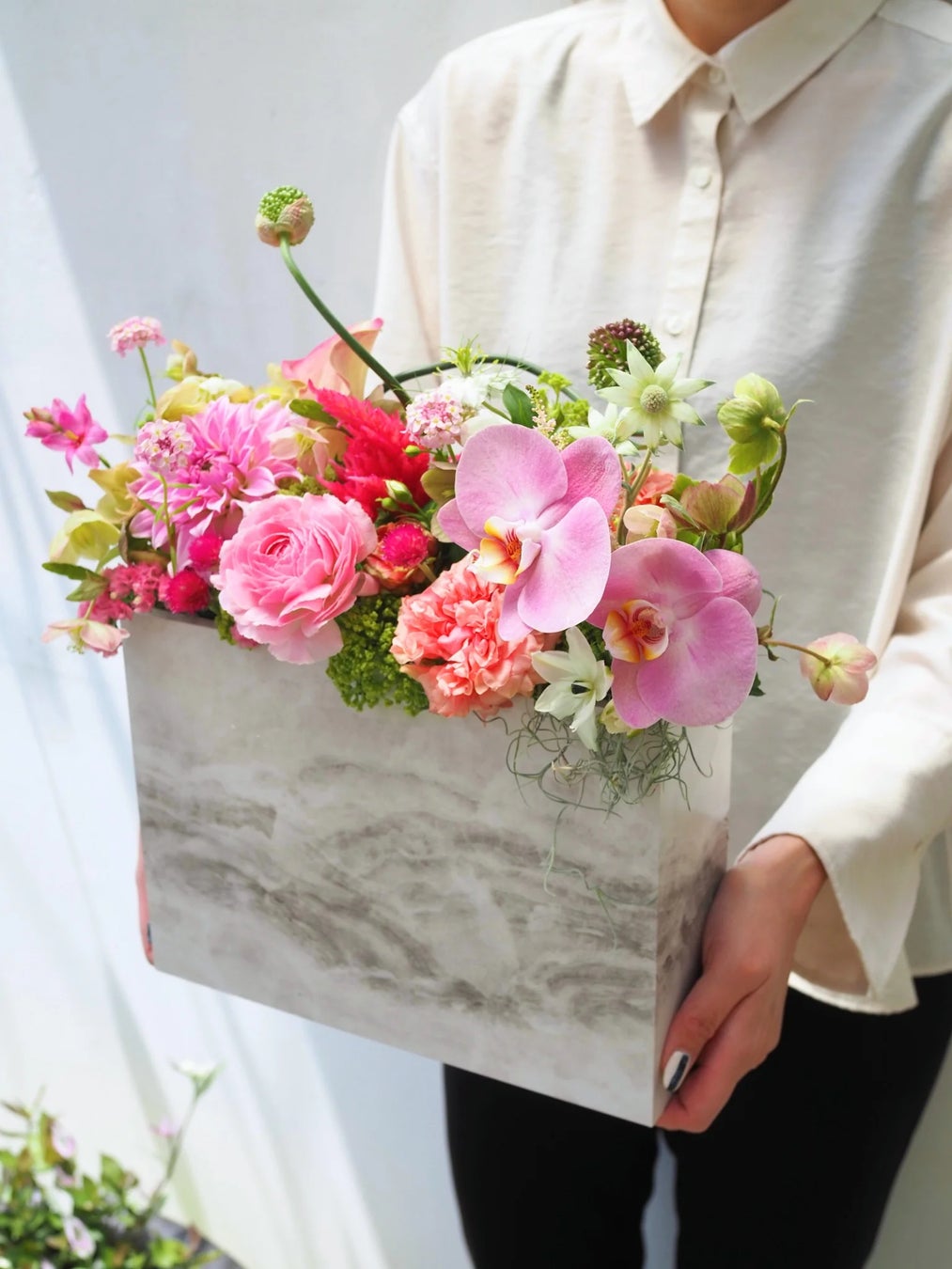 上品な大理石柄のベースに、フラワーデザイナー後藤亜希子がおまかせでお作りする季節の生花アレンジです。見た目は高級感のある大理石風ですが、素材は木製なのでとても軽く、気軽に飾っていただけるのが魅力。落ち着いた雰囲気と軽やかさを兼ね備えた、贈り物にもご自宅用にもおすすめのフラワーギフトです。お花は旬のものをふんだんに使い、花材の動きや表情をいかしたナチュラルで洗練されたデザインに仕上げます。蕾が開くことで少しずつ姿が変わり、日々の変化を楽しんでいただけます。