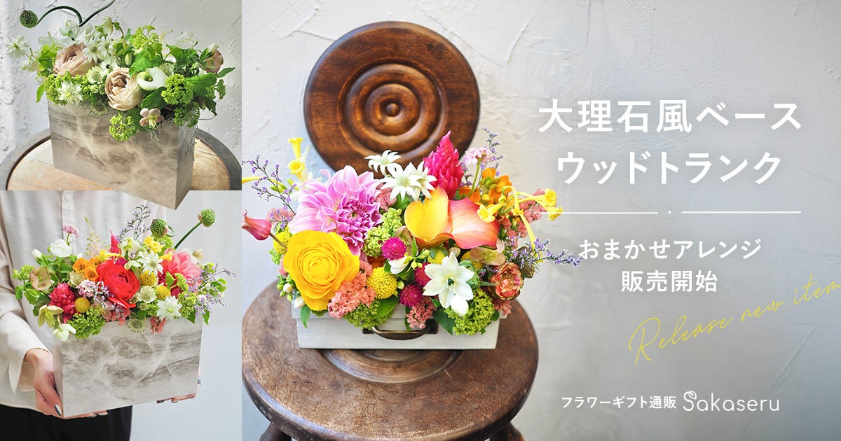 お祝い花販売プラットフォームSakaseru(運営:株式会社Sakaseru/本社:愛知県名古屋市)大理石風ベースとウッドトランクの鮮やかなおまかせフラワーアレンジの販売を開始しました。