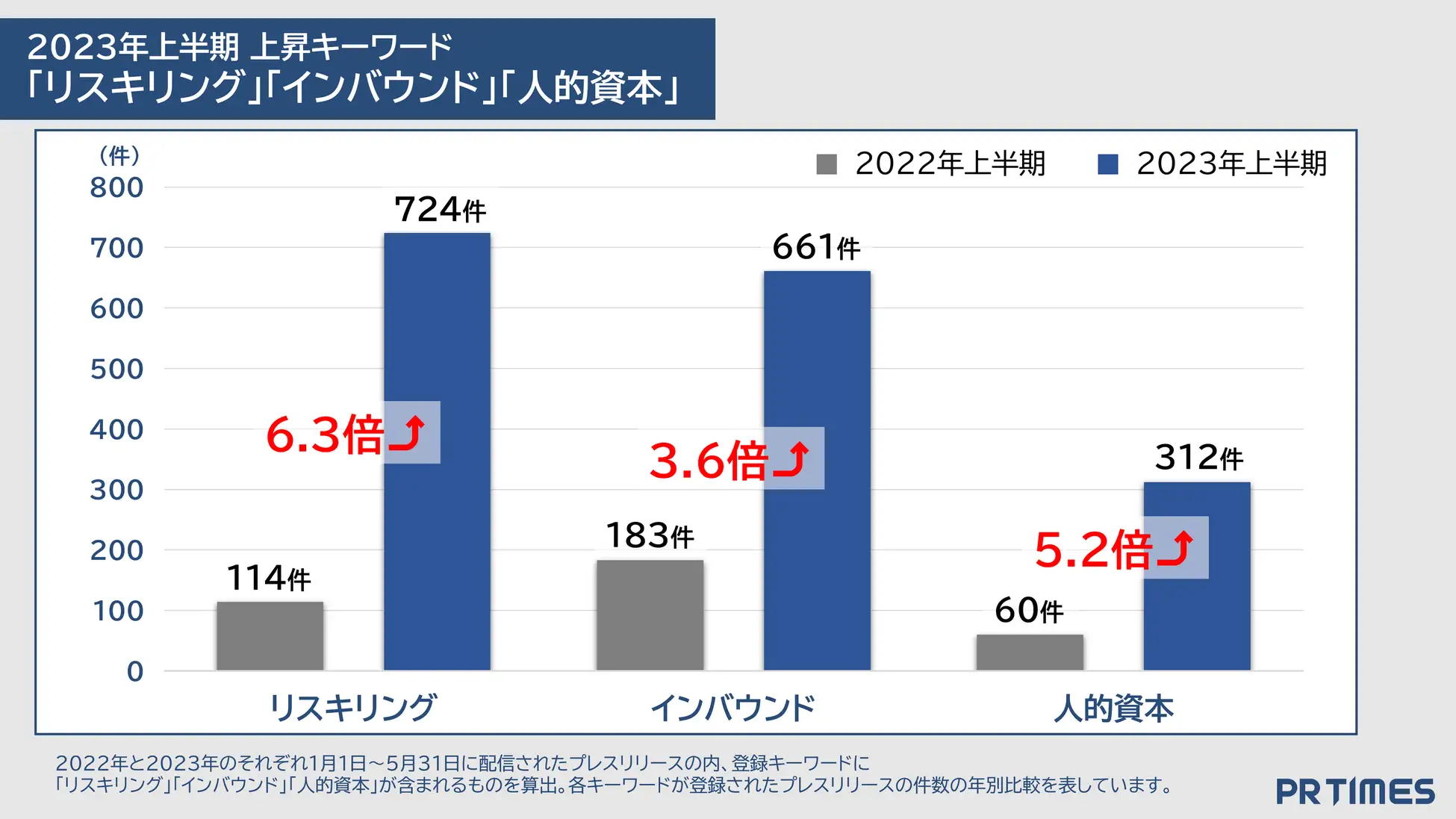 また関連キーワードと言える「リスキリング」も2023年上半期(1月~5月)は、724件のプレスリリースでキーワードが使用され、昨年同期(1月~5月)比で6.3倍超に伸びており、法人向け研修サービスから個人向けリスキリングサービスまで多種多様なサービスが新たに発表されています。