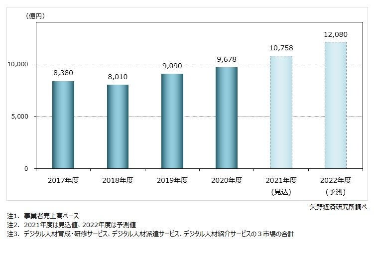 また、矢野経済研究所の調査によると、2020年度のデジタル人材関連サービス市場規模(デジタル人材育成・研修サービス、デジタル人材派遣サービス、デジタル人材紹介サービス3市場の合計)は、前年度比6.5%増の9,678億円と推計しています。