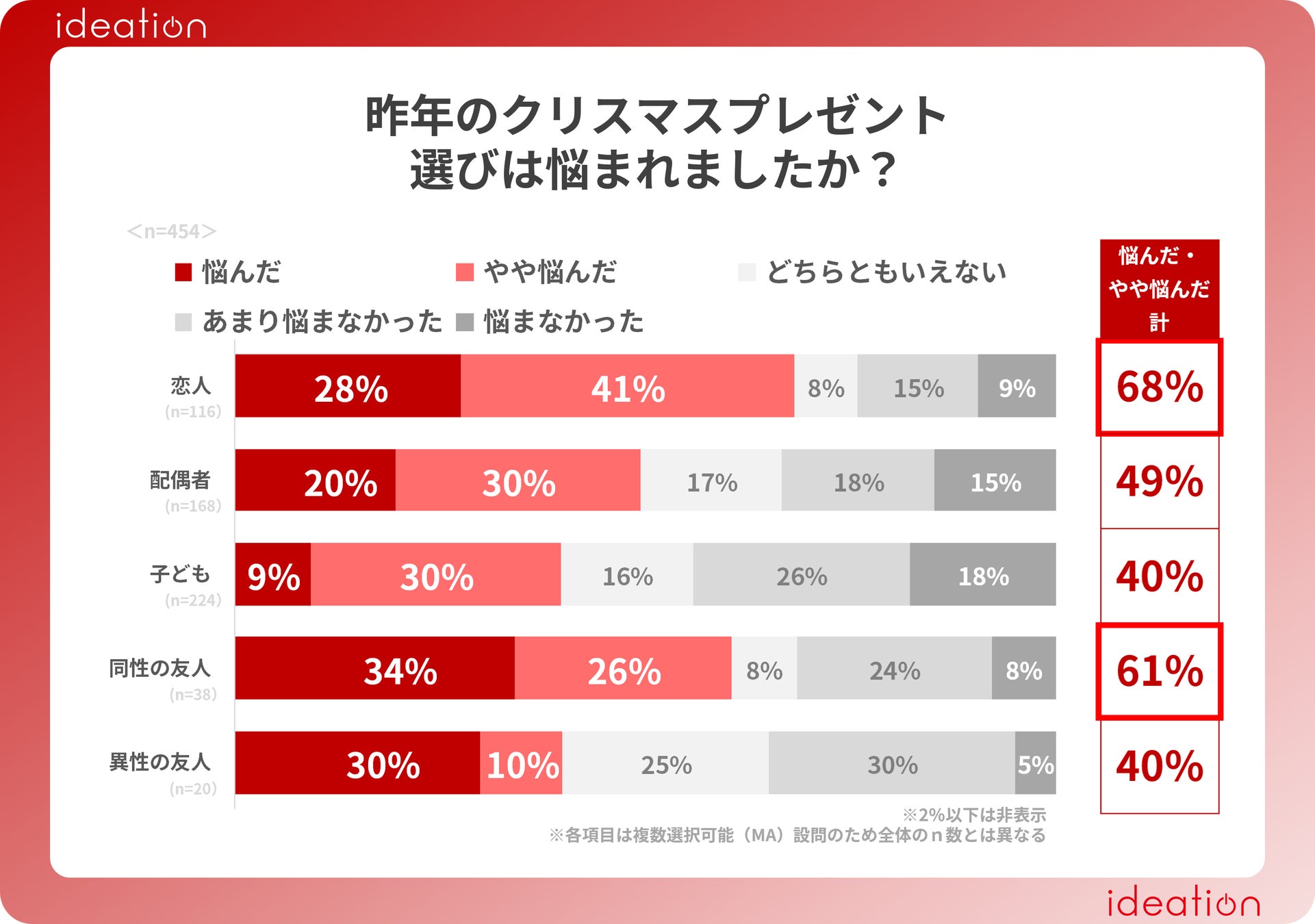 今回の調査では、昨年クリスマスプレゼントを贈った人のうち、「恋人」や「同性の友人」へのプレゼント選びに悩む傾向が顕著にみられました。